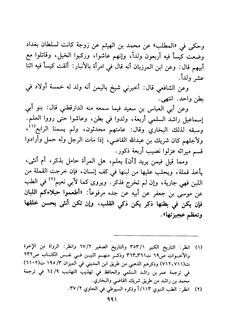 ومما قيل فيمن يريد [أن] يعلم، هل المرأة حامل بذكر، أم أنثى، يأخذ قملة، ويحلب علهيا من لبنها في كف إنسان، فإن خرجت القملة من اللبن فهي جارية، وإن لم تخرج فذك. ويروى كما لابي نعيم في الطب عن موسى بن جعفر عن أبيه عن جده مرفوعًا: "أطعموا حبلاءكم اللبان فإن يكن في بطنها ذكر يكن ذكي القلب، ,إن تكن أنثى يحسن خلقها وتعظم عجيزتها".