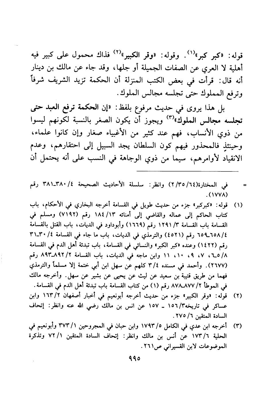 قوله: "كبر كبر". وقوله: "وقر الكبير" فذاك محمول على كبير فيه أهلية لا العري عن الصفات الجميلة أو جلها، وقد جاء عن مالك بن دينار أنه قال: قرأت في بعض الكتب المنزلة أن الحكمة تزيد الشريف شرفًا وترفع المملوك حتى تجلسه مجالس الملوك.