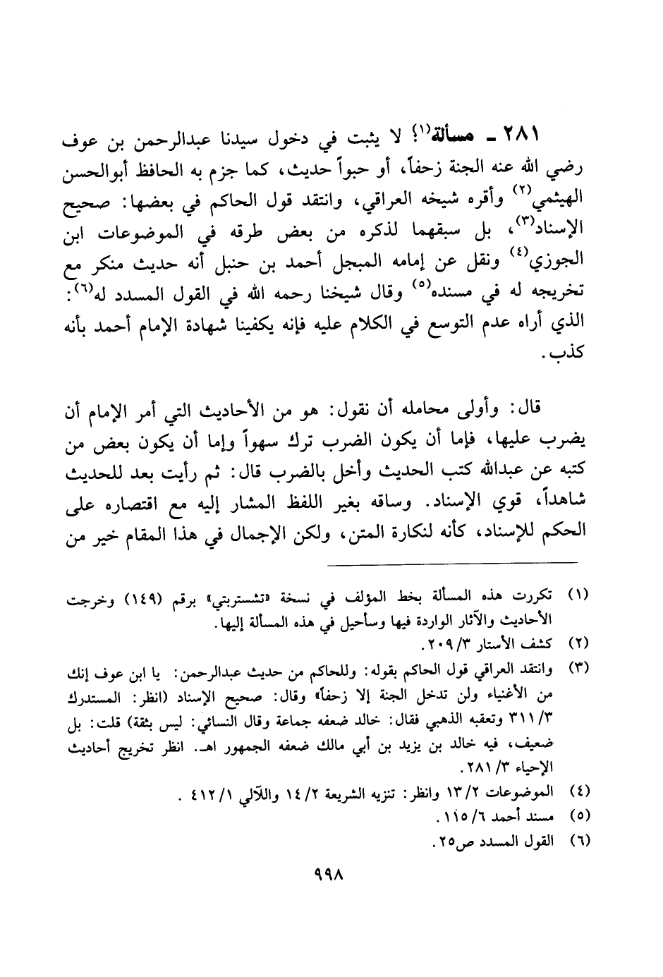 281 - مسألة: لا يثبت في دخول سيدنا عبد الرحمن بن عوف رضي الله عنه الجنة زحفًا، أو حبوًا حديث، كما جزم به الحافظ أبو الحسن الهيثمي وأقره شيخه العراقي، وانتقد قول الحاكم في بعضها: صحيح الإسناد، بل سبقهما لذكره من بعض طرقه في الموضوعات ابن الجوزي ونقل عن إمامه المبجل أحمد بن حنبل أنه حديث منكر مع تخريجه له في مسنده وقال شيخنا رحمه الله في القول المسدد له: الذي أراه عدم التوسع في الكلام عليه فإنه يكفينا شهادة الإمام أحمد بأنه كذب.