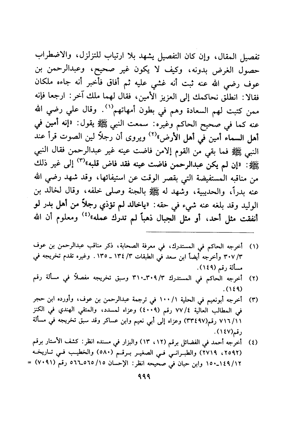 تفصيل المقال، وإن كان التفضيل يشهد بلا ارتياب للتزلزل، والاضطراب حصول الغرض بدونه، وكيف لا يكون غير صحيح، وعبد الرحمن بن عوف رضي الله عنه ثبت أنه غشي عليه ثم أفاق فأخبر أنه جاءه ملكان فقالا: انطلق نحاكمك إلى العزيز الأمين، فقال لهما ملك آخر: ارجعا فإنه ممن كتبت لهم السعادة وهم في بطون أمهاتهم. وقال علي رضي الله عنه كما في صحيح الحاكم وغيره: سمعت النبي صلى الله عليه وسلم يقول: "إنه أمين في أهل السماء أمين في أهل الأرض" ويروى أن رجلاً لين الصوت قرأ عند النبي صلى الله عليه وسلم فما بقي من القوم إلا من فاضت عينه غير عبد الرحمن فقال النبي صلى الله عليه وسلم: "إن لم يكن عبد الرحمن فاضت عينه فقد فاض قلبه" إلى غير ذلك من مناقبه المستفيضة التي بقصر الوقت عن استيفائها، وقد شهد رضي الله عنه بدرًا، والحديبية، وشهد له صلى الله عليه وسلم بالجنة وصلى خلفه، وقال لخالد بن الوليد وقد بلغه عنه شيء في حقه: "يا خالد لم تؤذي رجلاً من أهل بدر لو أنفقت مثل أحد، أو مثل الجبال ذهبًا لم تدرك عمله" ومعلوم أن الله