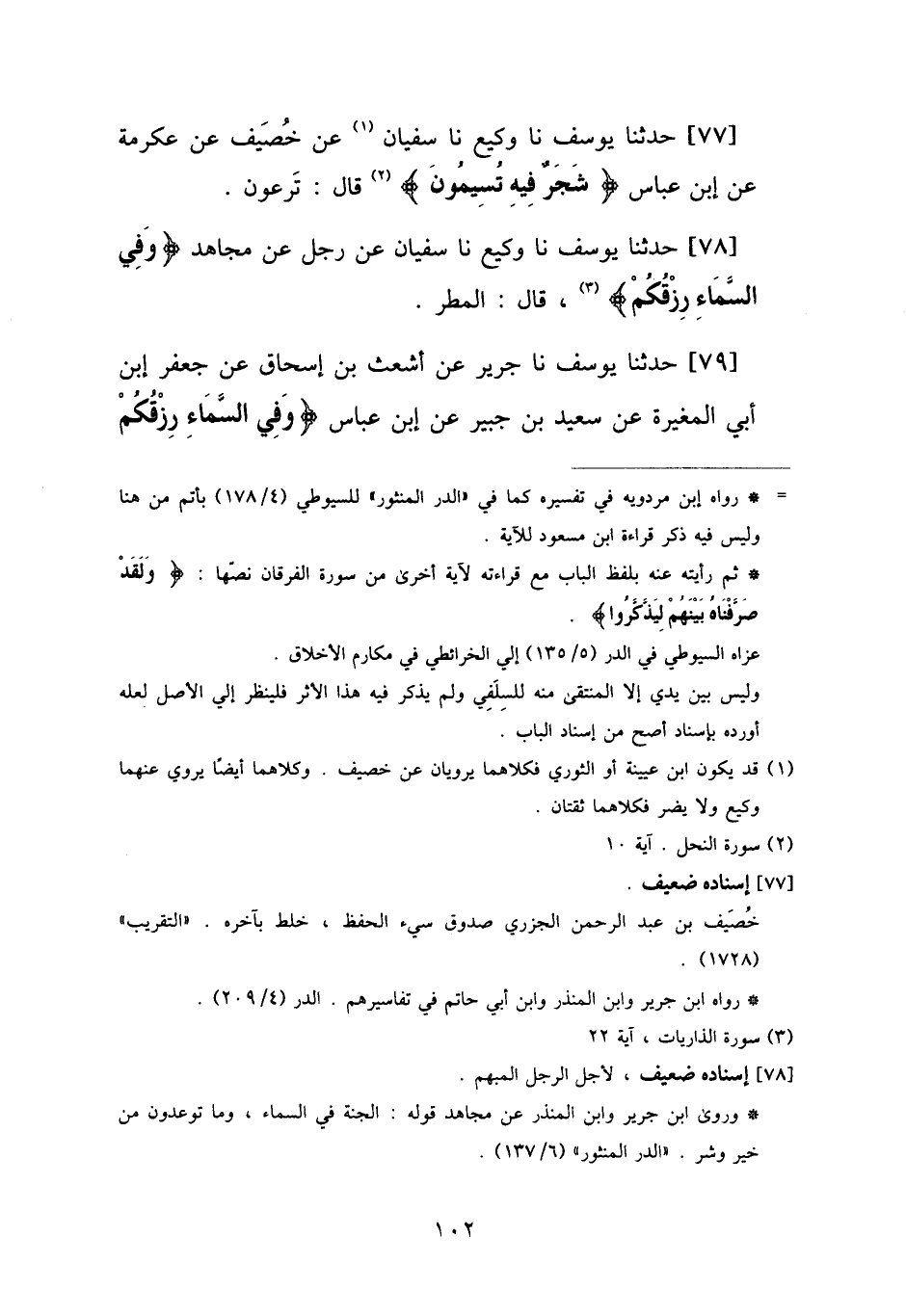 77 - حَدَّثَنَا يُوسُفُ، نا وَكِيعٌ، نا سُفْيَانُ، عَنْ خُصَيْفٍ، عَنْ عِكْرِمَةَ، عَنِ ابْنِ عَبَّاسٍ: " {§شَجَرٌ فِيهِ تُسِيمُونَ} [النحل: 10] قَالَ: تَرْعَوْنَ "