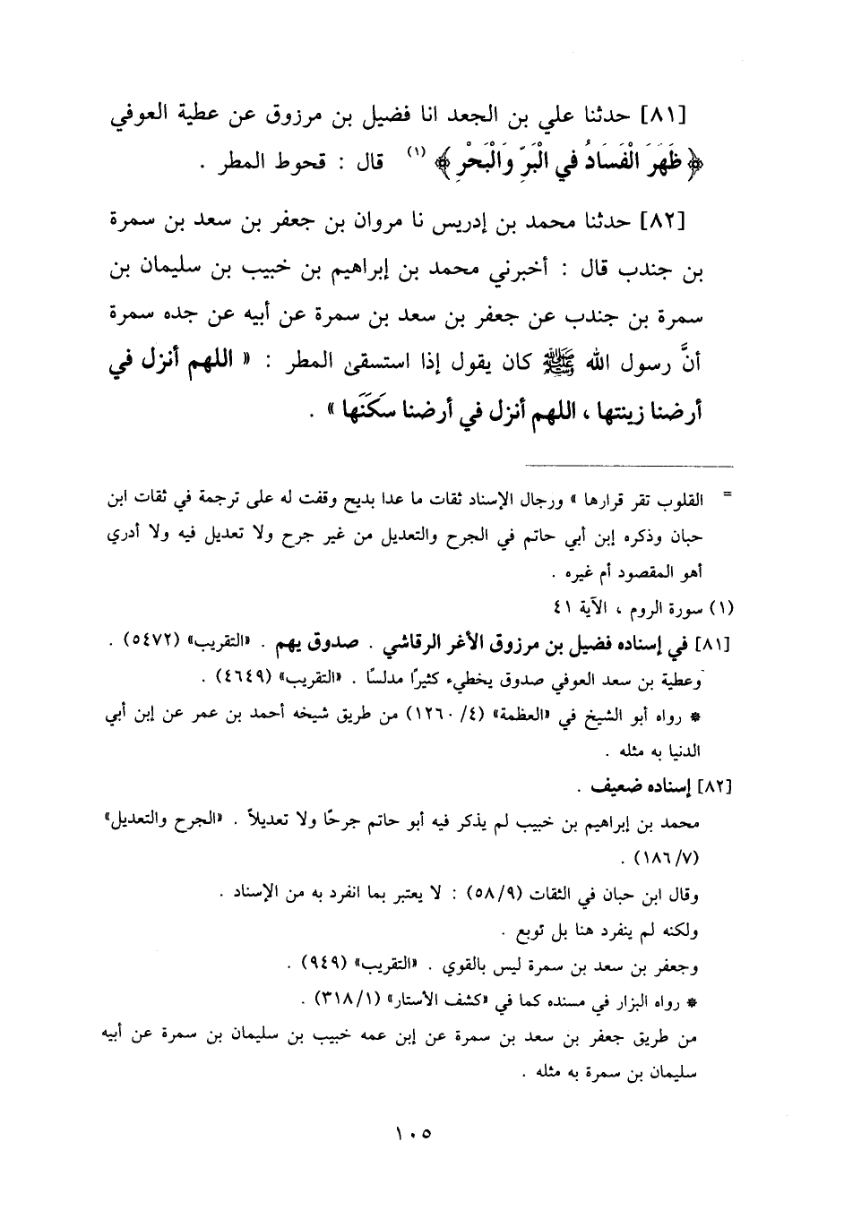81 - حَدَّثَنَا عَلِيُّ بْنُ الْجَعْدِ، أنا فُضَيْلُ بْنُ مَرْزُوقٍ، عَنْ عَطِيَّةَ الْعَوْفِيِّ: {§ظَهَرَ الْفَسَادُ فِي الْبَرِّ وَالْبَحْرِ} [الروم: 41] قَالَ: قُحُوطُ الْمَطَرِ "