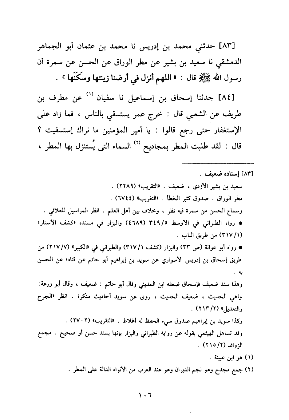 83 - حَدَّثَنِي مُحَمَّدُ بْنُ إِدْرِيسَ، نا مُحَمَّدُ بْنُ عُثْمَانَ أَبُو الْجَمَاهِرِ الدِّمَشْقِيُّ، نا سَعِيدُ بْنُ بَشِيرٍ، عَنْ مَطَرٍ الْوَرَّاقِ، عَنِ الْحَسَنِ، عَنْ سَمُرَةَ، أَنَّ رَسُولَ اللَّهِ صَلَّى اللهُ عَلَيْهِ وَسَلَّمَ قَالَ: «§اللَّهُمَّ أَنْزِلْ فِي أَرْضِنَا زِينَتَهَا وَسَكَنَهَا»