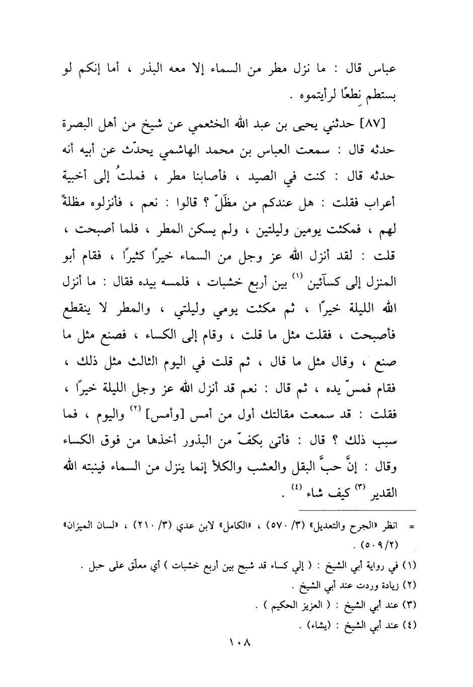 87 - حَدَّثَنِي يَحْيَى بْنُ عَبْدِ اللَّهِ الْخَثْعَمِيُّ، عَنْ شَيْخٍ مِنْ أَهْلِ الْبَصْرَةِ حَدَّثَهُ قَالَ: سَمِعْتُ الْعَبَّاسَ بْنَ مُحَمَّدٍ الْهَاشِمِيَّ، يُحَدِّثُ عَنْ أَبِيهِ، أَنَّهُ حَدَّثَهُ قَالَ: " §كُنْتُ فِي الصَّيْدِ، فَأَصَابَنَا مَطَرٌ، فَمِلْتُ إِلَى أَخْبِيَةِ أَعْرَابٍ فَقُلْتُ: هَلْ عِنْدَكُمْ مِنْ مِظَلٍّ؟ قَالُوا: نَعَمْ، فَأَنْزَلُوهُ مِظَلَّةً لَهُمْ، فَمَكَثْتُ يَوْمَيْنِ وَلَيْلَتَيْنِ، وَلَمْ يَسْكُنِ الْمَطَرُ، فَلَمَّا أَصْبَحْتُ، قُلْتُ: لَقَدْ أَنْزَلَ اللَّهُ عَزَّ وَجَلَّ مِنَ السَّمَاءِ خَيْرًا كَثِيرًا، فَقَامَ أَبُو الْمَنْزِلِ إِلَى كِسَائَيْنِ بَيْنَ أَرْبَعِ خَشَبَاتٍ، فَلَمَسُهُ بِيَدِهِ فَقَالَ: مَا أَنْزَلَ اللَّهُ اللَّيْلَةَ خَيْرًا، ثُمَّ مَكَثْتُ يَوْمِي وَلَيْلَتِي، وَالْمَطَرَ لَا يَنْقَطِعُ فَأَصْبَحْتُ، فَقُلْتُ مِثْلَ مَا قُلْتُ، وَقَامَ إِلَى الْكِسَاءِ، فَصَنَعَ مِثْلَ مَا صَنَعَ، وَقَالَ مِثْلَ مَا قَالَ، ثُمَّ قُلْتُ فِي الْيَوْمِ الثَّالِثِ مِثْلَ ذَلِكَ، فَقَامَ فَمَسَّ يَدَهُ، ثُمَّ قَالَ: نَعَمْ، قَدْ أَنْزَلَ اللَّهُ عَزَّ وَجَلَّ اللَّيْلَةَ خَيْرًا، فَقُلْتَ: قَدْ سَمِعْتُ مَقَالَتَكَ أَوَّلَ مِنْ أَمْسٍ وَأَمْسِ وَالْيَوْمَ، فَمَا سَبَبُ ذَلِكَ؟ قَالَ: فَأَتَى بِكَفٍّ مِنَ الْبُذُورِ أَخَذَهَا مِنْ فَوْقِ الْكِسَاءِ وَقَالَ: إِنَّ حَبَّ الْبَقْلِ وَالْعُشْبِ وَالْكَلَأِ إِنَّمَا يَنْزِلُ مِنَ السَّمَاءِ فَيُنْبِتُهُ اللَّهُ الْقَدِيرُ كَيْفَ شَاءَ "