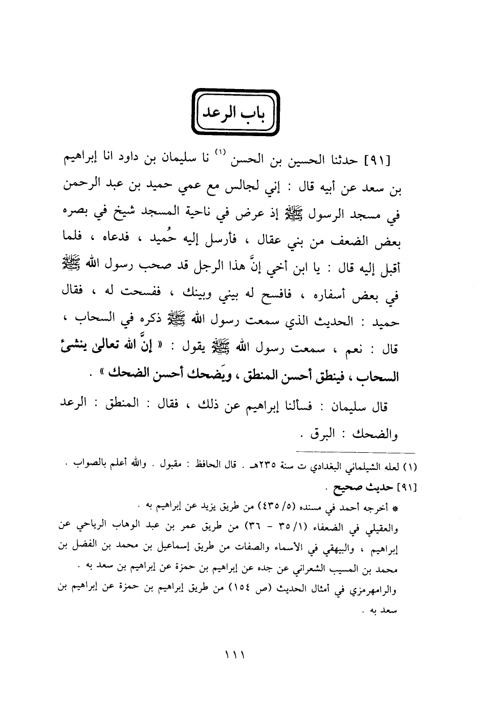91 - حَدَّثَنَا الْحُسَيْنُ بْنُ الْحَسَنِ، نا سُلَيْمَانُ بْنُ دَاوُدَ، أنا إِبْرَاهِيمُ بْنُ سَعْدٍ، عَنْ أَبِيهِ، قَالَ: " إِنِّي لَجَالِسٌ مَعَ عَمِّي حُمَيْدِ بْنِ عَبْدِ الرَّحْمَنِ فِي مَسْجِدِ الرَّسُولِ صَلَّى اللهُ عَلَيْهِ وَسَلَّمَ، إِذْ عَرَضَ فِي نَاحِيَةِ الْمَسْجِدِ شَيْخٌ فِي بَصَرِهِ بَعْضُ الضَّعْفِ مِنْ بَنِي عِقَالٍ، فَأَرْسَلَ إِلَيْهِ حُمَيْدٌ، فَدَعَاهُ، فَلَمَّا أَقْبَلَ إِلَيْهِ قَالَ: يَا ابْنَ أَخِي، إِنْ هَذَا الرَّجُلَ قَدْ صَحِبَ رَسُولَ اللَّهِ صَلَّى اللهُ عَلَيْهِ وَسَلَّمَ فِي بَعْضِ أَسْفَارِهِ، فَافْسَحْ لَهُ بَيْنِي وَبَيْنَكَ، فَفَسَحْتُ لَهُ، فَقَالَ حُمَيْدٌ: الْحَدِيثُ الَّذِي سَمِعْتَ رَسُولَ اللَّهِ صَلَّى اللهُ عَلَيْهِ وَسَلَّمَ، ذَكَرَهُ فِي السَّحَابُ، قَالَ: نَعَمْ، سَمِعْتُ رَسُولَ اللَّهِ صَلَّى اللهُ عَلَيْهِ وَسَلَّمَ يَقُولُ: «إِنَّ اللَّهَ تَعَالَى §يُنْشِئُ السَّحَابَ، فَيَنْطِقُ أَحْسَنَ الْمَنْطِقِ، وَيَضْحَكُ أَحْسَنَ الضَّحِكِ» . قَالَ سُلَيْمَانُ: فَسَأَلْنَا إِبْرَاهِيمَ عَنْ ذَلِكَ، فَقَالَ: الْمَنْطِقُ: الرَّعْدُ، وَالضَّحِكُ: الْبَرْقُ