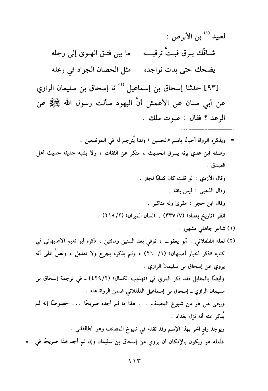 93 - حَدَّثَنَا إِسْحَاقُ بْنُ إِسْمَاعِيلَ، نا إِسْحَاقُ بْنُ سُلَيْمَانَ الرَّازِيُّ، عَنْ أَبِي سِنَانٍ، عَنِ الْأَعْمَشِ: " أَنَّ الْيَهُودَ §سَأَلَتْ رَسُولَ اللَّهِ صَلَّى اللهُ عَلَيْهِ وَسَلَّمَ عَنِ الرَّعْدِ، فَقَالَ: «صَوْتُ مَلَكٍ»