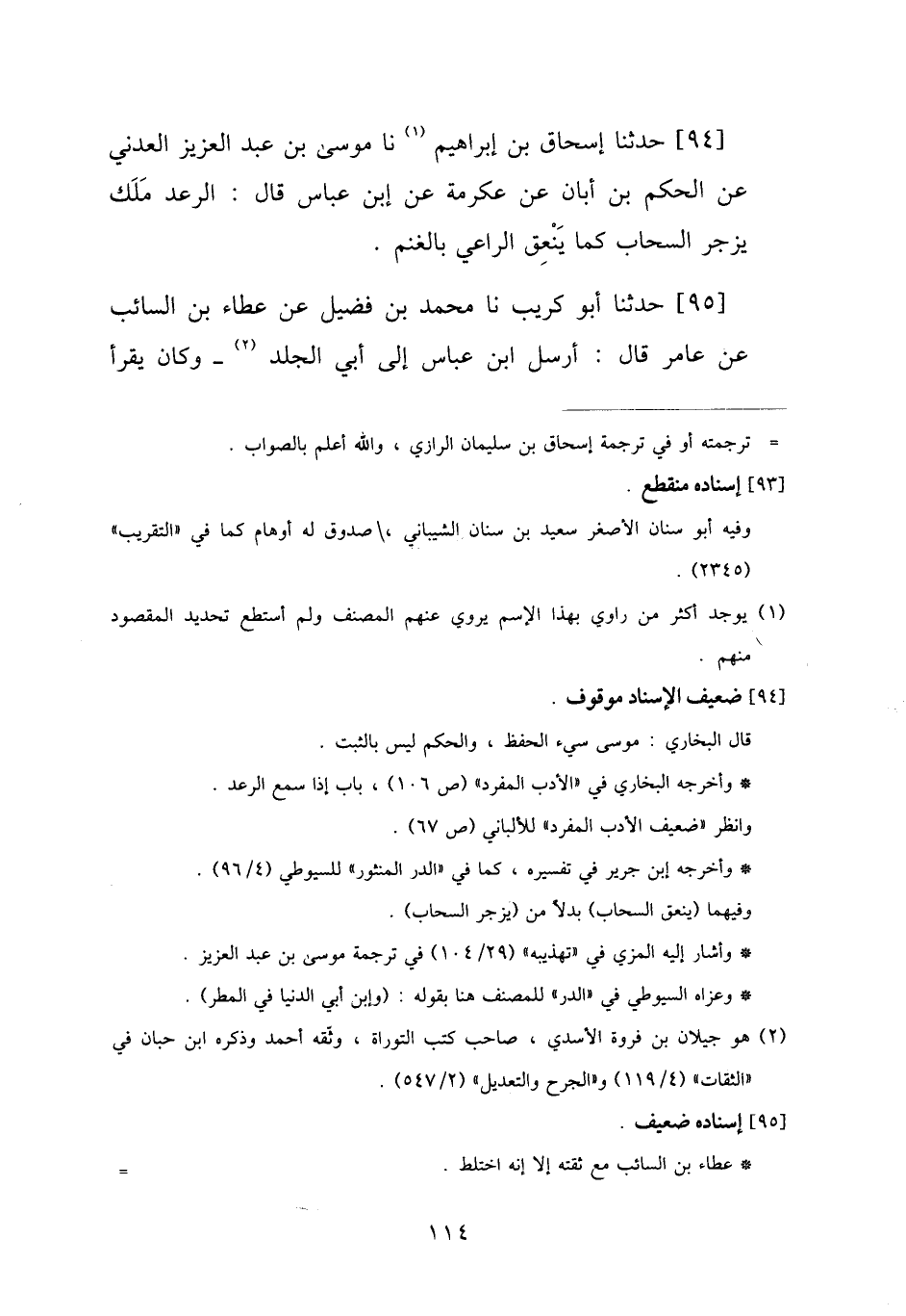 94 - حَدَّثَنَا إِسْحَاقُ بْنُ إِبْرَاهِيمَ، نا مُوسَى بْنُ عَبْدِ الْعَزِيزِ الْعَدَنِيُّ، عَنِ الْحَكَمِ بْنِ أَبَانَ، عَنْ عِكْرِمَةَ، عَنِ ابْنِ عَبَّاسٍ، قَالَ: «§الرَّعْدُ مَلَكٌ يَزْجُرُ السَّحَابَ كَمَا يَنْعِقُ الرَّاعِي بِالْغَنَمِ»
