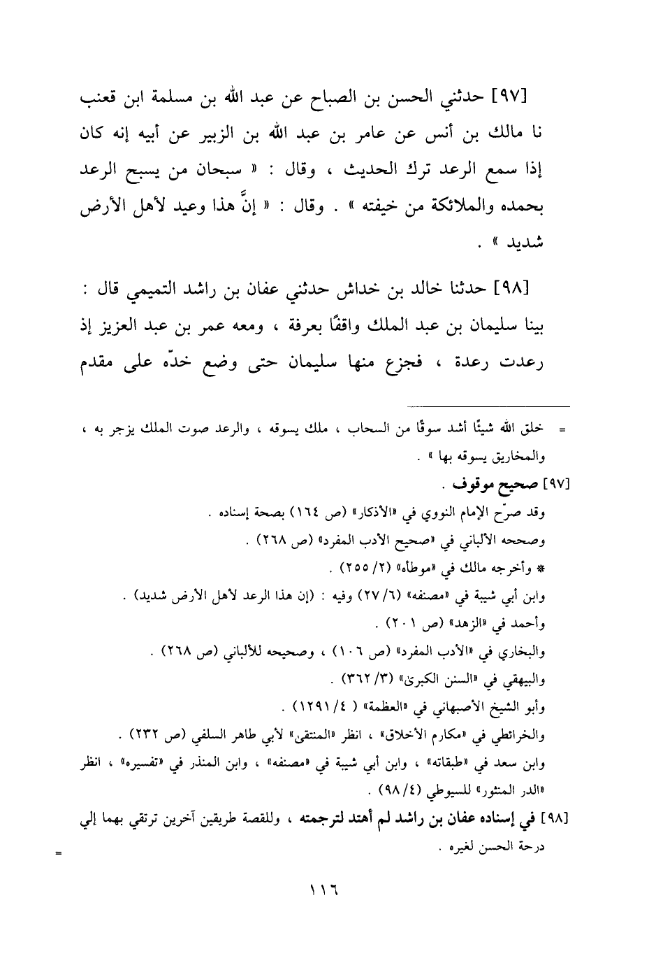 97 - حَدَّثَنِي الْحَسَنُ بْنُ الصَّبَّاحِ، عَنْ عَبْدِ اللَّهِ بْنِ مَسْلَمَةَ بْنِ قَعْنَبٍ، نا مَالِكُ بْنُ أَنَسٍ، عَنْ عَامِرِ بْنِ عَبْدِ اللَّهِ بْنِ الزُّبَيْرِ، عَنْ أَبِيهِ: أَنَّهُ كَانَ إِذَا سَمِعَ الرَّعْدَ تَرَكَ الْحَدِيثَ، وَقَالَ: سُبْحَانَ مَنْ يُسَبَّحُ الرَّعْدُ بِحَمْدِهِ وَالْمَلَائِكَةُ مِنْ خِيفَتِهِ، وقال إِنَّ §هَذَا وَعِيدٌ لِأَهْلِ الْأَرْضِ شَدِيدٌ "