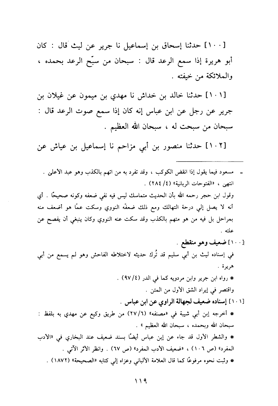 100 - حَدَّثَنَا إِسْحَاقُ بْنُ إِسْمَاعِيلَ، نا جَرِيرٌ، عَنْ لَيْثٍ، قَالَ: " كَانَ أَبُو هُرَيْرَةَ إِذَا سَمِعَ الرَّعْدَ قَالَ: «§سُبْحَانَ مَنْ سَبَّحَ الرَّعْدُ بِحَمْدِهِ، وَالْمَلَائِكَةُ مِنْ خِيفَتِهِ»