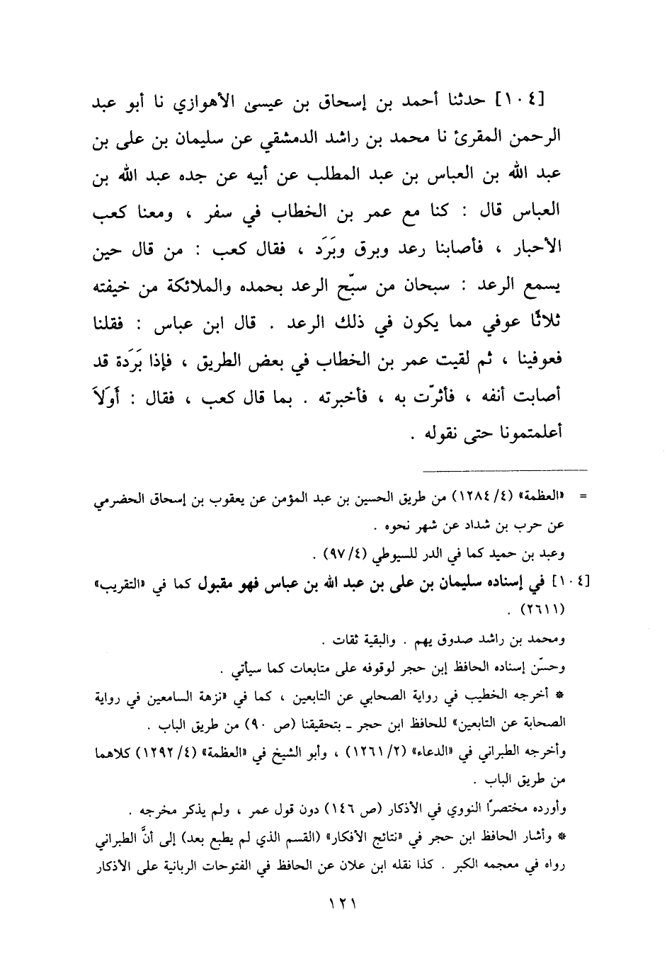 104 - حَدَّثَنَا أَحْمَدُ بْنُ إِسْحَاقَ بْنِ عِيسَى الْأَهْوَازِيُّ، نا أَبُو عَبْدِ الرَّحْمَنِ الْمُقْرِئُ، نا مُحَمَّدُ بْنُ رَاشِدٍ الدِّمَشْقِيُّ، عَنْ سُلَيْمَانَ بْنِ عَلِيِّ بْنِ عَبْدِ اللَّهِ بْنِ الْعَبَّاسِ بْنِ عَبْدِ الْمُطَّلِبِ، عَنْ أَبِيهِ، عَنْ جَدِّهِ عَبْدِ اللَّهِ بْنِ الْعَبَّاسِ، قَالَ: " كُنَّا مَعَ عُمَرَ بْنِ الْخَطَّابِ فِي سَفَرٍ وَمَعَنَا كَعْبُ الْأَحْبَارِ، فَأَصَابَنَا رَعْدٌ وَبَرْقٌ وَبَرْدٌ، فَقَالَ كَعْبٌ: " مَنْ قَالَ حِينَ يَسْمَعُ الرَّعْدَ: §سُبْحَانَ مَنْ سَبَّحَ الرَّعْدُ بِحَمْدِهِ وَالْمَلَائِكَةُ مِنْ خِيفَتِهِ ثَلَاثًا، عُوفِيَ مِمَّا يَكُونُ فِي ذَلِكَ الرَّعْدِ، قَالَ ابْنُ عَبَّاسٍ: فَقُلْنَا فَعُوفِينَا، ثُمَّ لَقِيتُ عُمَرَ بْنَ الْخَطَّابِ فِي بَعْضِ الطَّرِيقِ، فَإِذَا بَرْدَةٌ قَدْ أَصَابَتْ أَنْفَهُ فَأَثَرْتُ بِهِ، فَأَخْبَرْتُهُ بِمَا قَالَ كَعْبٌ، فَقَالَ: أَوَلَا أَعْلَمْتُمُونَا حَتَّى نَقُولَهُ "