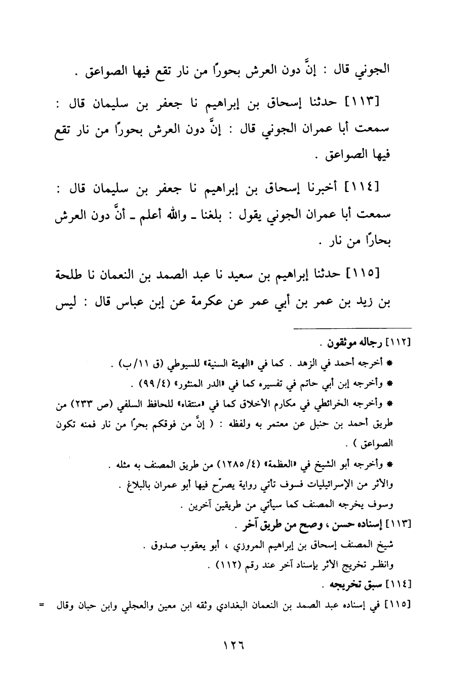 114 - أَخْبَرَنَا إِسْحَاقُ بْنُ إِبْرَاهِيمَ، نا جَعْفَرُ بْنُ سُلَيْمَانَ، قَالَ: سَمِعْتُ أَبَا عِمْرَانَ الْجَوْنِيَّ، يَقُولُ: بَلَغَنَا - وَاللَّهُ أَعْلَمُ - أَنَّ §دُونَ الْعَرْشِ بِحَارًا مِنْ نَارٍ "