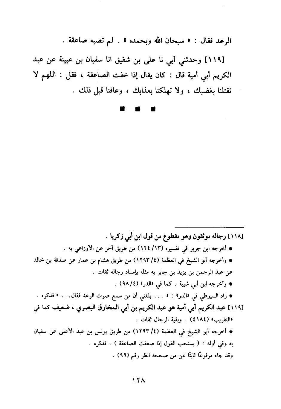 119 - وَحَدَّثَنِي أَبِي، نا عَلِيُّ بْنُ شَقِيقٍ، أنا سُفْيَانُ بْنُ عُيَيْنَةَ، عَنْ عَبْدِ الْكَرِيمِ أَبِي أُمَيَّةَ، قَالَ: " كَانَ يُقَالُ: §إِذَا خِفْتَ الصَّاعِقَةَ فَقُلِ: اللَّهُمَّ لَا تَقْتُلْنَا بِغَضَبِكَ، وَلَا تُهْلِكْنَا بِعَذَابِكَ، وَعَافِنَا قَبْلَ ذَلِكَ "