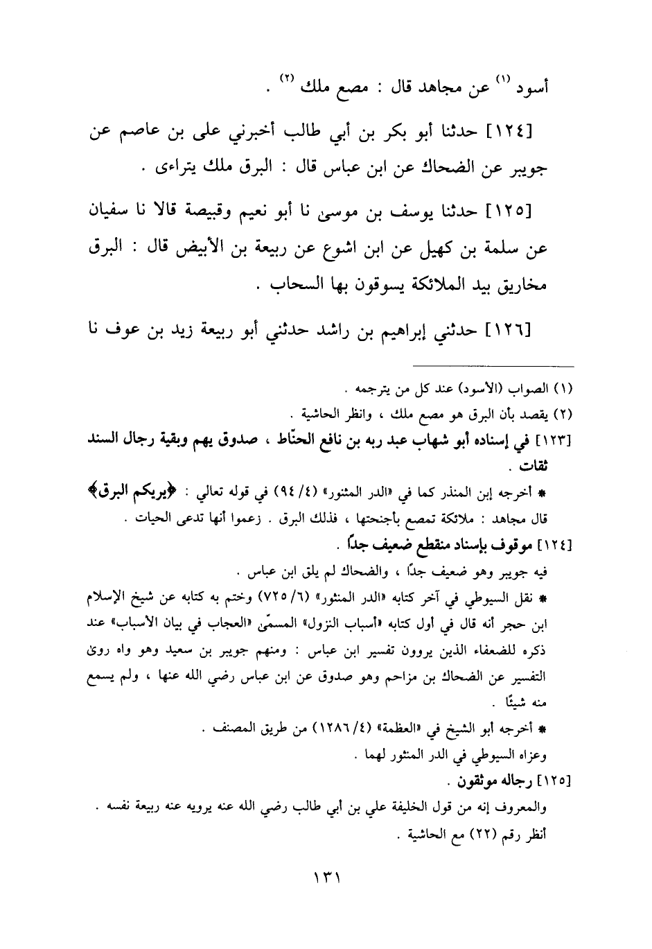 125 - حَدَّثَنَا يُوسُفُ بْنُ مُوسَى، نا أَبُو نُعَيْمٍ، وَقَبِيصَةُ، قَالَا: نا سُفْيَانُ، عَنْ سَلَمَةَ بْنِ كُهَيْلٍ، عَنِ ابْنِ أَشْوَعَ، عَنْ رَبِيعَةَ بْنِ الْأَبْيَضِ، قَالَ: «§الْبَرْقُ مَخَارِيقُ بِيَدِ الْمَلَائِكَةِ يَسُوقُونَ بِهَا السَّحَابَ»