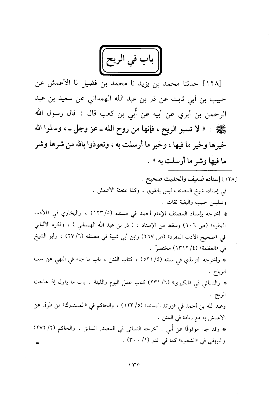 128 - حَدَّثَنَا مُحَمَّدُ بْنُ يَزِيدَ، نا مُحَمَّدُ بْنُ فُضَيْلٍ، نا الْأَعْمَشُ، عَنْ حَبِيبِ بْنِ أَبِي ثَابِتٍ، عَنْ ذَرِّ بْنِ عَبْدِ اللَّهِ الْهَمْدَانِيِّ، عَنْ سَعِيدِ بْنِ عَبْدِ الرَّحْمَنِ بْنِ أَبْزَى، عَنْ أَبِيهِ، عَنْ أُبَيِّ بْنِ كَعْبٍ، قَالَ: قَالَ رَسُولُ اللَّهِ صَلَّى اللهُ عَلَيْهِ وَسَلَّمَ: «§لَا تَسُبُّوا الرِّيحَ، فَإِنَّهَا مِنْ رُوحِ اللَّهِ عَزَّ وَجَلَّ، وَسَلُوا اللَّهَ خَيْرَهَا، وَخَيْرَ مَا فِيهَا، وَخَيْرَ مَا أُرْسِلَتْ بِهِ، وَتَعَوَّذُوا بِاللَّهِ مِنْ شَرِّهَا، وَشَرِّ مَا فِيهَا، وَشَرِّ مَا أُرْسِلَتْ بِهِ»