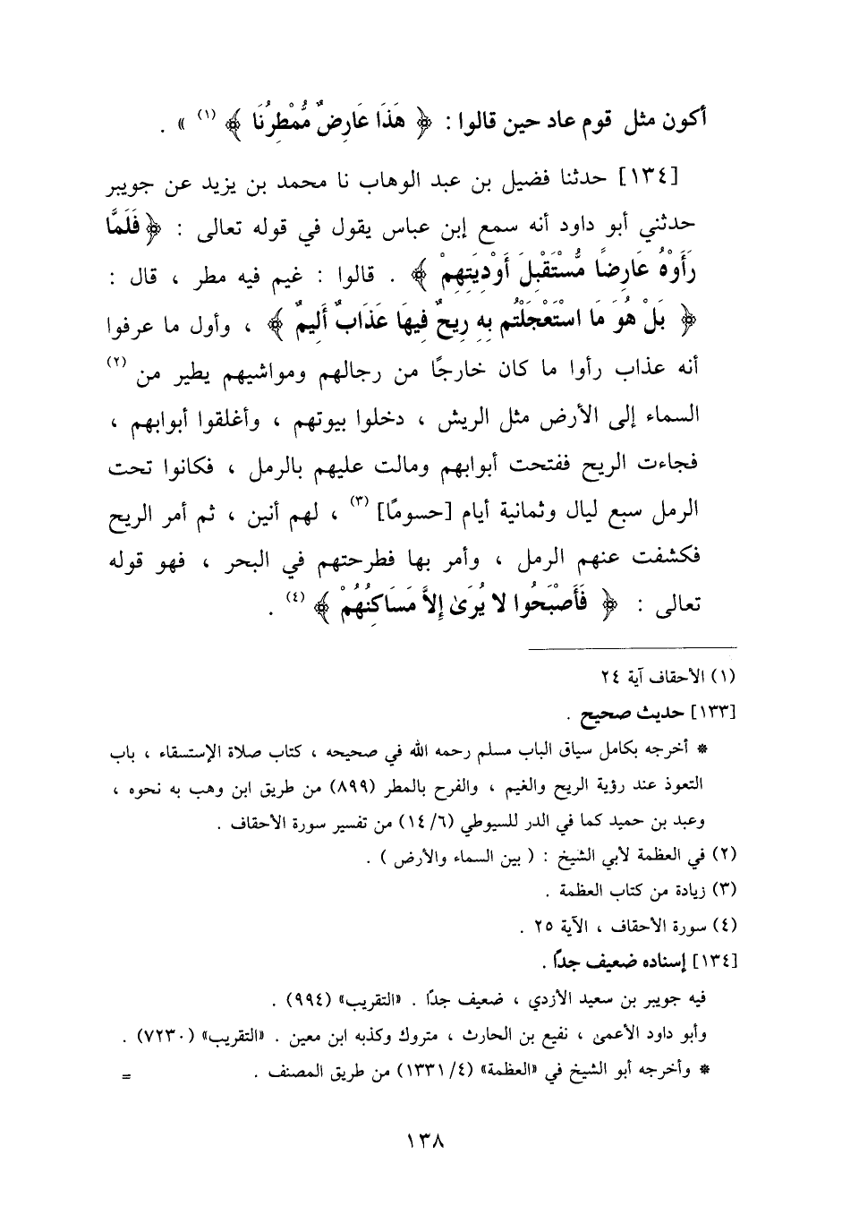 134 - حَدَّثَنَا فُضَيْلُ بْنُ عَبْدِ الْوَهَّابِ، نا مُحَمَّدُ بْنُ يَزِيدَ، عَنْ جُوَيْبِرٍ، حَدَّثَنِي أَبُو دَاوُدَ، أَنَّهُ سَمِعَ ابْنَ عَبَّاسٍ يَقُولُ فِي قَوْلِهِ تَعَالَى: {فَلَمَّا رَأَوْهُ عَارِضًا مُسْتَقْبِلَ أَوْدِيَتِهِمْ} [الأحقاف: 24] ، " قَالُوا: §غَيْمٌ فِيهِ مَطَرٌ، قَالَ: {بَلْ هُوَ مَا اسْتَعْجَلْتُمْ بِهِ رِيحٌ فِيهَا عَذَابٌ أَلِيمٌ} [الأحقاف: 24] ، وَأَوَّلُ مَا عَرَفُوا أَنَّهُ عَذَابٌ رَأَوْا مَا كَانَ خَارِجًا مِنْ رِجَالِهِمْ وَمَواشِيهِمْ يَطِيرُ مِنَ السَّمَاءِ إِلَى الْأَرْضِ مِثْلَ الرِّيشِ، دَخَلُوا بُيُوتَهُمْ، وَأَغْلَقُوا أَبْوَابَهُمْ، فَجَاءَتِ الرِّيحُ فَفَتَحْتُ أَبْوَابَهُمْ، وَمَالَتْ عَلَيْهِمْ بِالرَّمْلِ، فَكَانُوا تَحْتَ الرَّمَلِ سَبْعَ لَيَالٍ وَثَمَانِيَةَ أَيَّامٍ حُسُومًا، لَهُمْ أَنِينٌ، ثُمَّ أَمَرَ الرِّيحَ فَكَشَفَتْ عَنْهُمُ الرَّمَلَ، وَأَمَرَ بِهَا فَطَرَحَتْهُمْ فِي الْبَحْرِ، فَهُوَ قَوْلُهُ تَعَالَى: {فَأَصْبَحُوا لَا يُرَى إِلَّا مَسَاكِنُهُمْ} [الأحقاف: 25] "