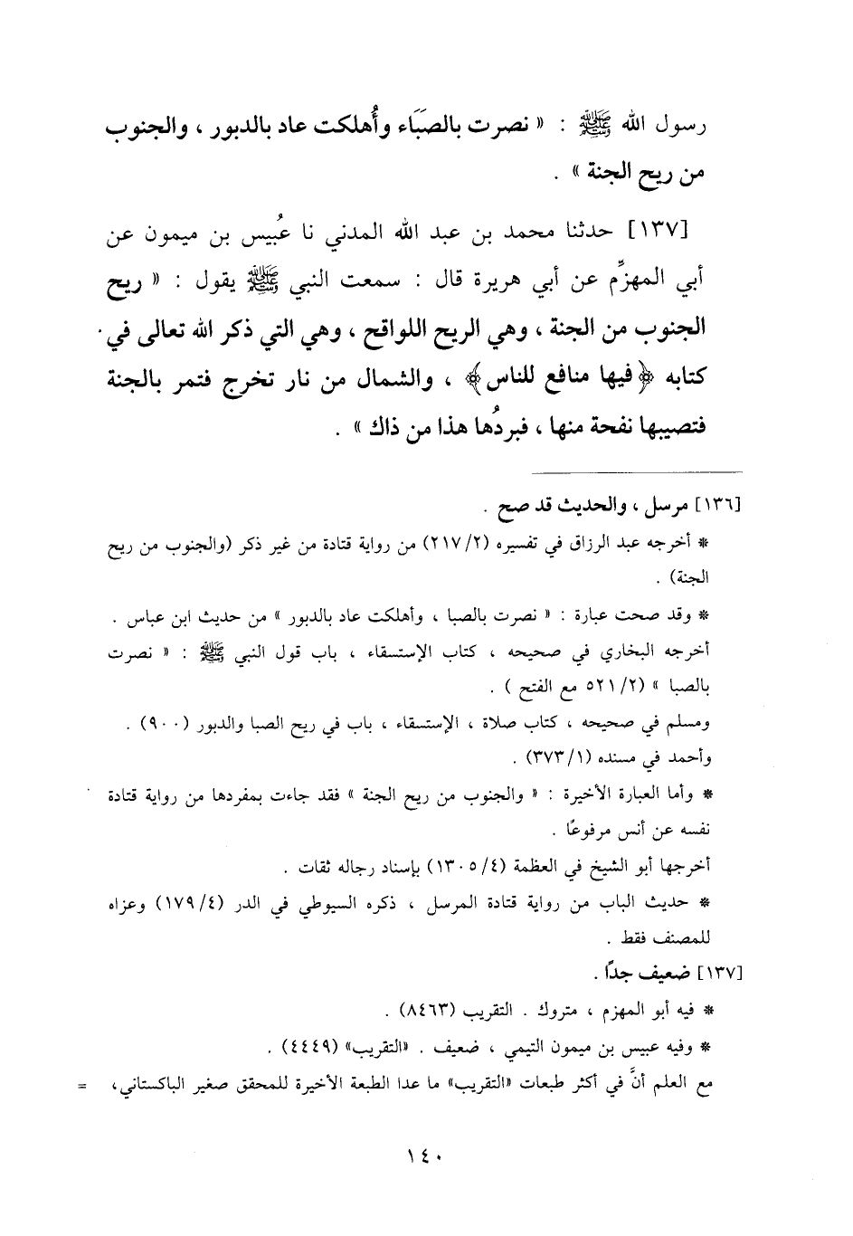 137 - حَدَّثَنَا مُحَمَّدُ بْنُ عَبْدِ اللَّهِ الْمَدَنِيُّ، نا عُبَيْسُ بْنُ مَيْمُونٍ، عَنْ أَبِي الْمُهَزِّمِ، عَنْ أَبِي هُرَيْرَةَ، قَالَ: سَمِعْتُ النَّبِيَّ صَلَّى اللهُ عَلَيْهِ وَسَلَّمَ يَقُولُ: «§رِيحُ الْجَنُوبِ مِنَ الْجَنَّةِ، وَهِيَ الرِّيحُ اللَّوَاقِحُ، وَهِيَ الَّتِي ذَكَرَ اللَّهُ تَعَالَى فِي كِتَابِهِ فِيهَا مَنَافِعُ لِلنَّاسِ، وَالشَّمَالُ مِنْ نَارٍ تَخْرُجُ فَتَمُرُّ بِالْجَنَّةِ فَتُصِيبُهَا نَفْحَةٌ مِنْهَا، فَبَرْدُهَا هَذَا مِنْ ذَاكَ»