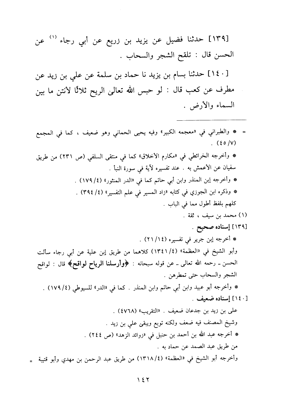 139 - حَدَّثَنَا فُضَيْلٌ، عَنْ يَزِيدَ بْنِ زُرَيْعٍ، عَنْ أَبِي رَجَاءٍ، عَنِ الْحَسَنِ، قَالَ: «§تُلْقِحُ الشَّجَرَ وَالسَّحَابَ»
