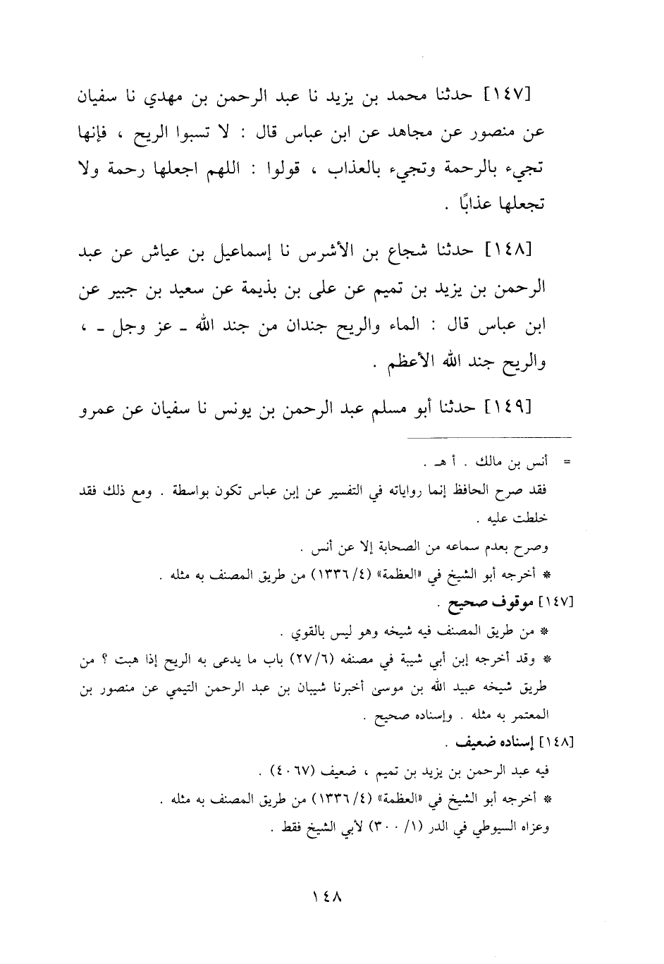 147 - حَدَّثَنَا مُحَمَّدُ بْنُ يَزِيدَ، نا عَبْدُ الرَّحْمَنِ بْنُ مَهْدِيٍّ، نا سُفْيَانُ، عَنْ مَنْصُورٍ، عَنْ مُجَاهِدٍ، عَنِ ابْنِ عَبَّاسٍ، قَالَ: " §لَا تَسُبُّوا الرِّيحَ، فَإِنَّهَا تَجِيءُ بِالرَّحْمَةِ، وَتَجِيءُ بِالْعَذَابِ، قُولُوا: اللَّهُمَّ اجْعَلْهَا رَحْمَةً، وَلَا تَجْعَلْهَا عَذَابًا "