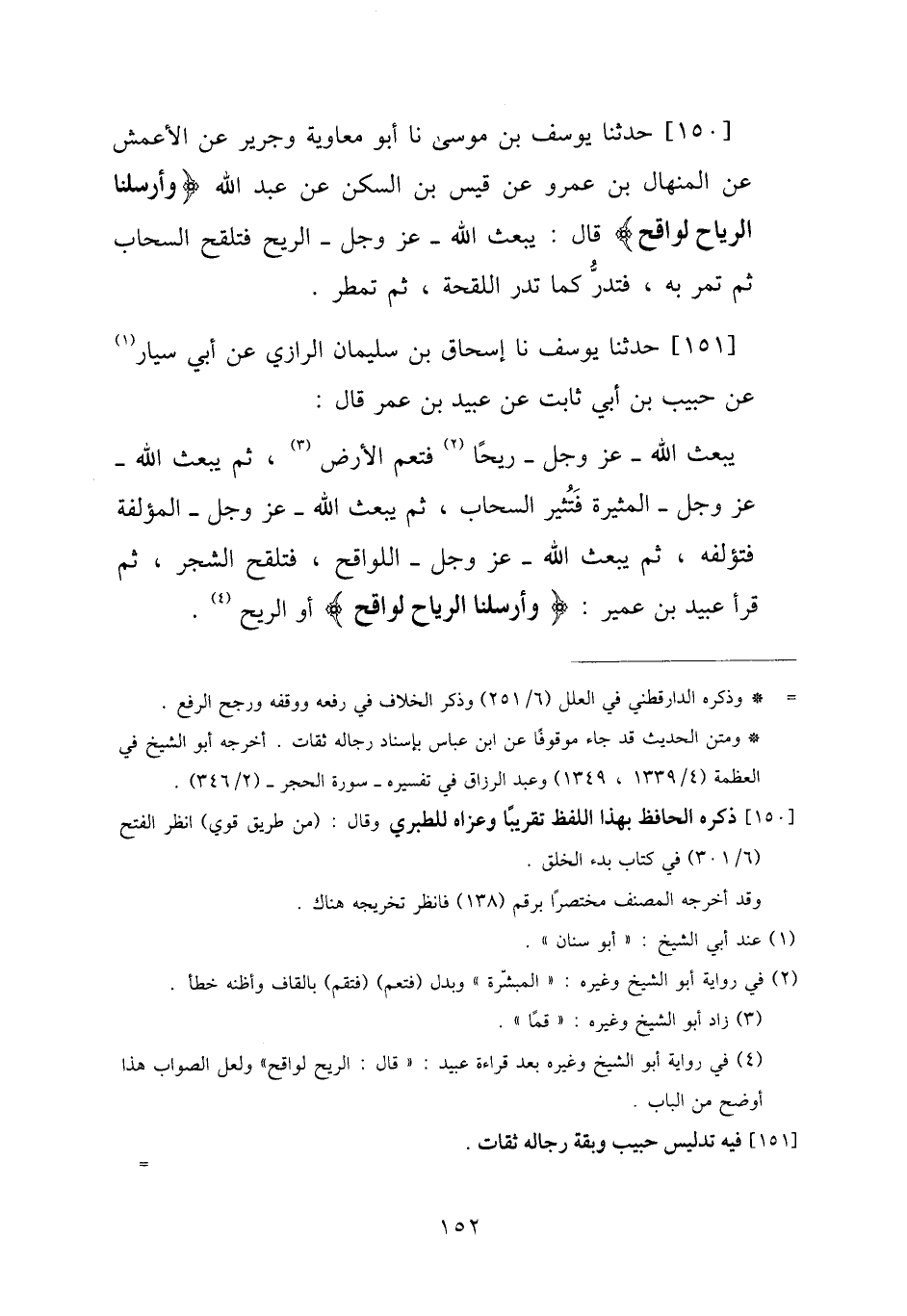 151 - حَدَّثَنَا يُوسُفُ، نا إِسْحَاقُ بْنُ سُلَيْمَانَ الرَّازِيُّ، عَنْ أَبِي سَيَّارٍ، عَنْ حَبِيبِ بْنِ أَبِي ثَابِتٍ، عَنْ عُبَيْدِ بْنِ عُمَرَ، قَالَ: «§يَبْعَثُ اللَّهُ عَزَّ وَجَلَّ رِيحًا فَتَعُمُّ الْأَرْضَ، ثُمَّ يَبْعَثُ اللَّهُ عَزَّ وَجَلَّ الْمُثِيرَةَ فَتُثِيرُ السَّحَابَ، ثُمَّ يَبْعَثُ اللَّهُ عَزَّ وَجَلَّ الْمُؤَلِّفَةَ فَتُؤَلِّفُهُ، ثُمَّ يَبْعَثُ اللَّهُ عَزَّ وَجَلَّ اللَّوَاقِحَ فَتُلْقِحُ الشَّجَرَ» ، ثُمَّ قَرَأَ عُبَيْدُ بْنُ عُمَيْرٍ: {وَأَرْسَلْنَا الرِّيَاحَ لَوَاقِحَ} [الحجر: 22] أَوِ الرِّيحَ "