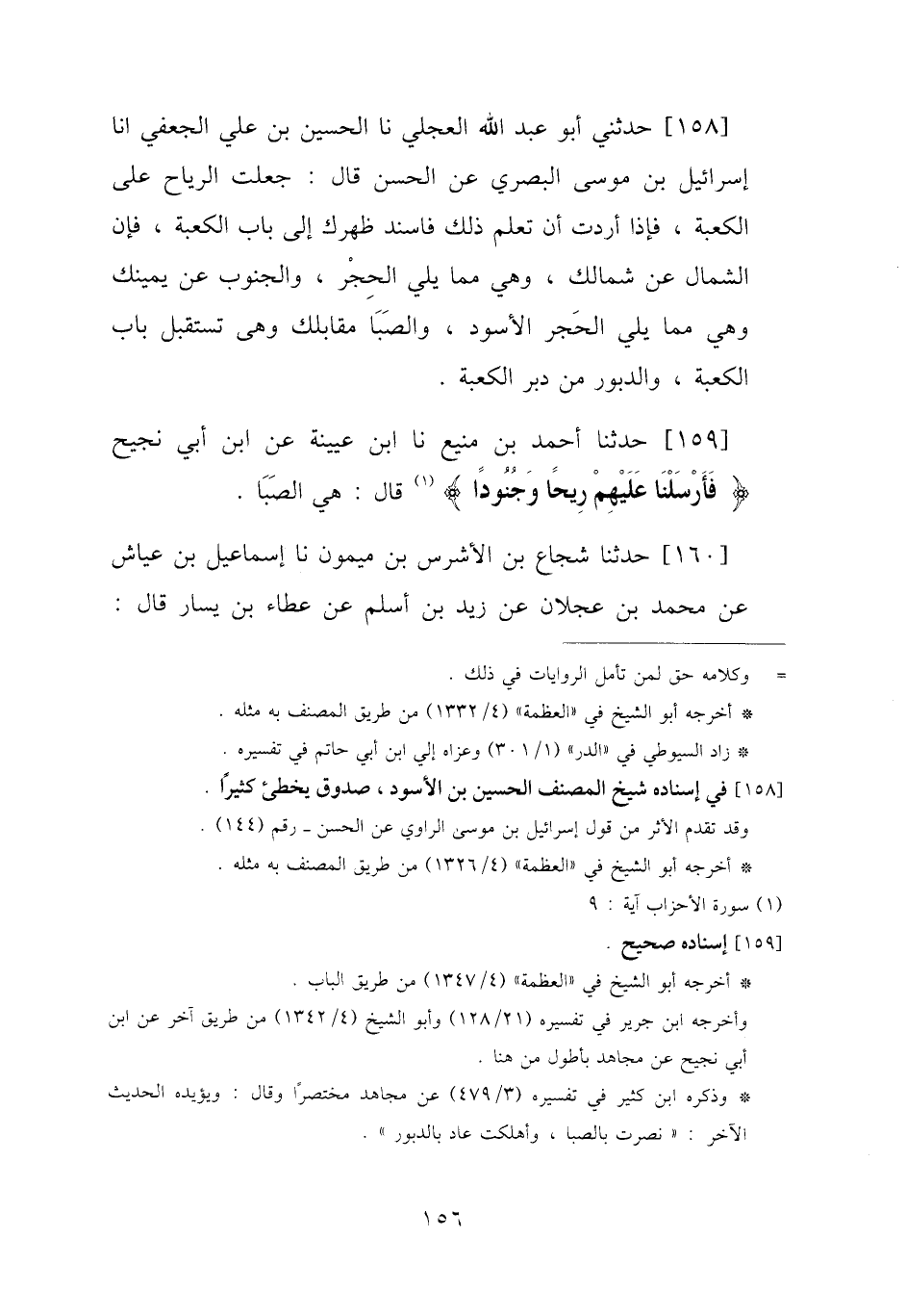 159 - حَدَّثَنَا أَحْمَدُ بْنُ مَنِيعٍ، نا ابْنُ عُيَيْنَةَ، عَنِ ابْنِ أَبِي نَجِيحٍ: " {§فَأَرْسَلْنَا عَلَيْهِمْ رِيحًا وَجُنُودًا} [الأحزاب: 9] قَالَ: هِيَ الصَّبَا "