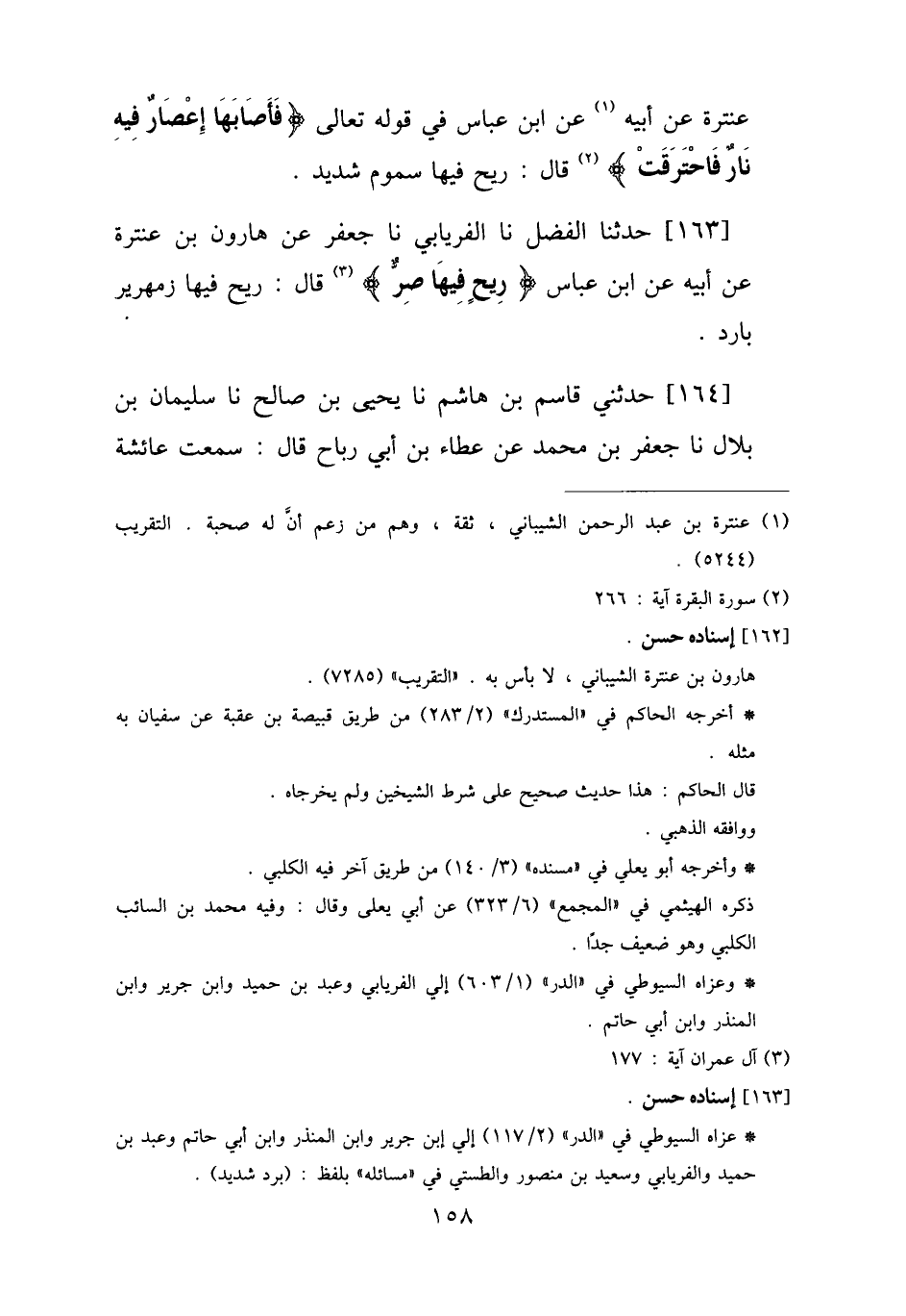 163 - حَدَّثَنَا الْفَضْلُ، نا الْفِرْيَابِيُّ، نا جَعْفَرٌ، عَنْ هَارُونَ بْنِ عَنْتَرَةَ، عَنْ أَبِيهِ، عَنِ ابْنِ عَبَّاسٍ: {رِيحٌ فِيهَا صِرٌّ} [آل عمران: 117] قَالَ: «§رِيحٌ فِيهَا زَمْهَرِيرٌ بَارِدٌ»