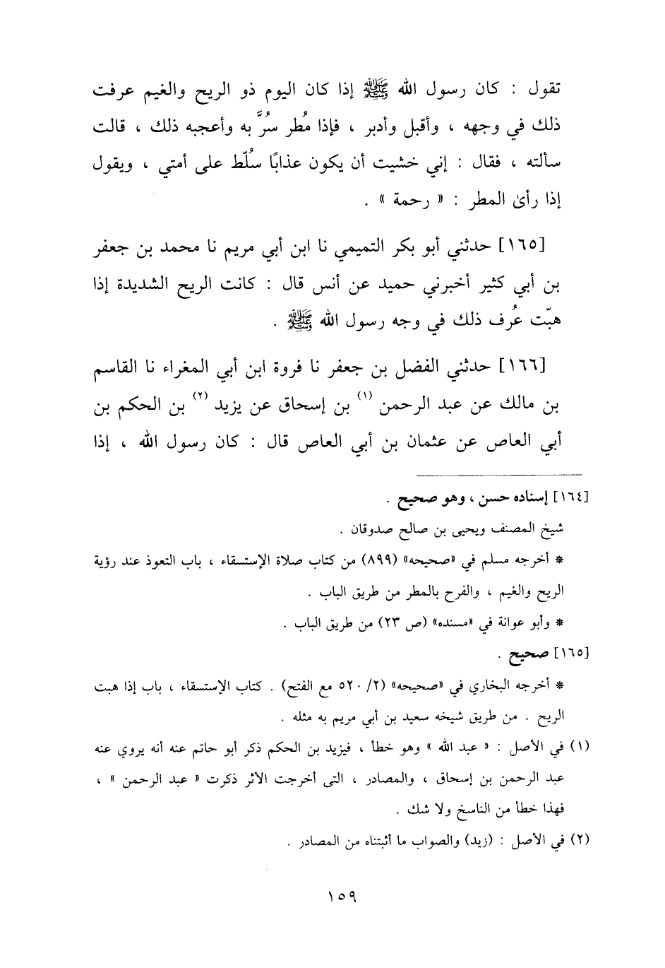 166 - حَدَّثَنِي الْفَضْلُ بْنُ جَعْفَرٍ، نا فَرْوَةُ بْنُ أَبِي الْمَغْرَاءِ، نا الْقَاسِمُ بْنُ مَالِكٍ، عَنْ عَبْدِ الرَّحْمَنِ بْنِ إِسْحَاقَ، عَنْ يَزِيدَ بْنِ الْحَكَمِ بْنِ أَبِي الْعَاصِ، عَنْ عُثْمَانَ بْنِ أَبِي الْعَاصِ، قَالَ: كَانَ رَسُولُ اللَّهِ إِذَا -[160]- اشْتَدَّتِ الرِّيحُ الشَّمَالُ قَالَ: «اللَّهُمَّ إِنِّي §أَعُوذُ بِكَ مِنْ شَرِّ مَا أُرْسِلَتْ بِهِ»