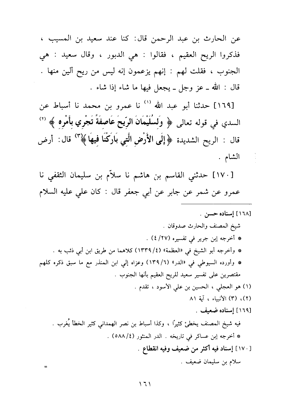 169 - حَدَّثَنَا أَبُو عَبْدِ اللَّهِ، نا عَمْرُو بْنُ مُحَمَّدٍ، نا أَسْبَاطٌ، عَنِ السُّدِّيِّ، فِي قَوْلِهِ تَعَالَى: {§وَلِسُلَيْمَانَ الرِّيحَ عَاصِفَةً تَجْرِي بِأَمْرِهِ} [الأنبياء: 81] قَالَ: الرِّيحُ الشَّدِيدَةُ، {إِلَى الْأَرْضِ الَّتِي بَارَكْنَا فِيهَا} [الأنبياء: 81] قَالَ: أَرْضُ الشَّامِ "