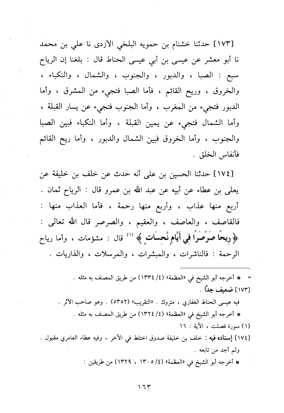 174 - حَدَّثَنَا الْحُسَيْنُ بْنُ عَلِيٍّ، أَنَّهُ حُدِّثَ عَنْ خَلَفِ بْنِ خَلِيفَةَ، عَنْ يَعْلَى بْنِ عَطَاءٍ، عَنْ أَبِيهِ، عَنْ عَبْدِ اللَّهِ بْنِ عَمْرٍو، قَالَ: " §الرِّيَاحُ ثَمَانٍ: أَرْبَعٌ مِنْهَا عَذَابٌ، وَأَرْبَعٌ مِنْهَا رَحْمَةٌ، فَأَمَّا الْعَذَابُ مِنْهَا: فَالْقَاصِفُ، وَالْعَاصِفُ، وَالْعَقِيمُ، وَالصَّرْصَرُ، قَالَ اللَّهُ تَعَالَى: {رِيحًا صَرْصَرًا فِي أَيَّامٍ نَحِسَاتٍ} [فصلت: 16] قَالَ: مَشْؤُمَاتٌ، وَأَمَا رِيَاحُ الرَّحْمَةِ: فَالنَّاشِرَاتُ، وَالْمُبَشِّرَاتُ، وَالْمُرْسَلَاتُ، وَالذَّارِيَاتُ "