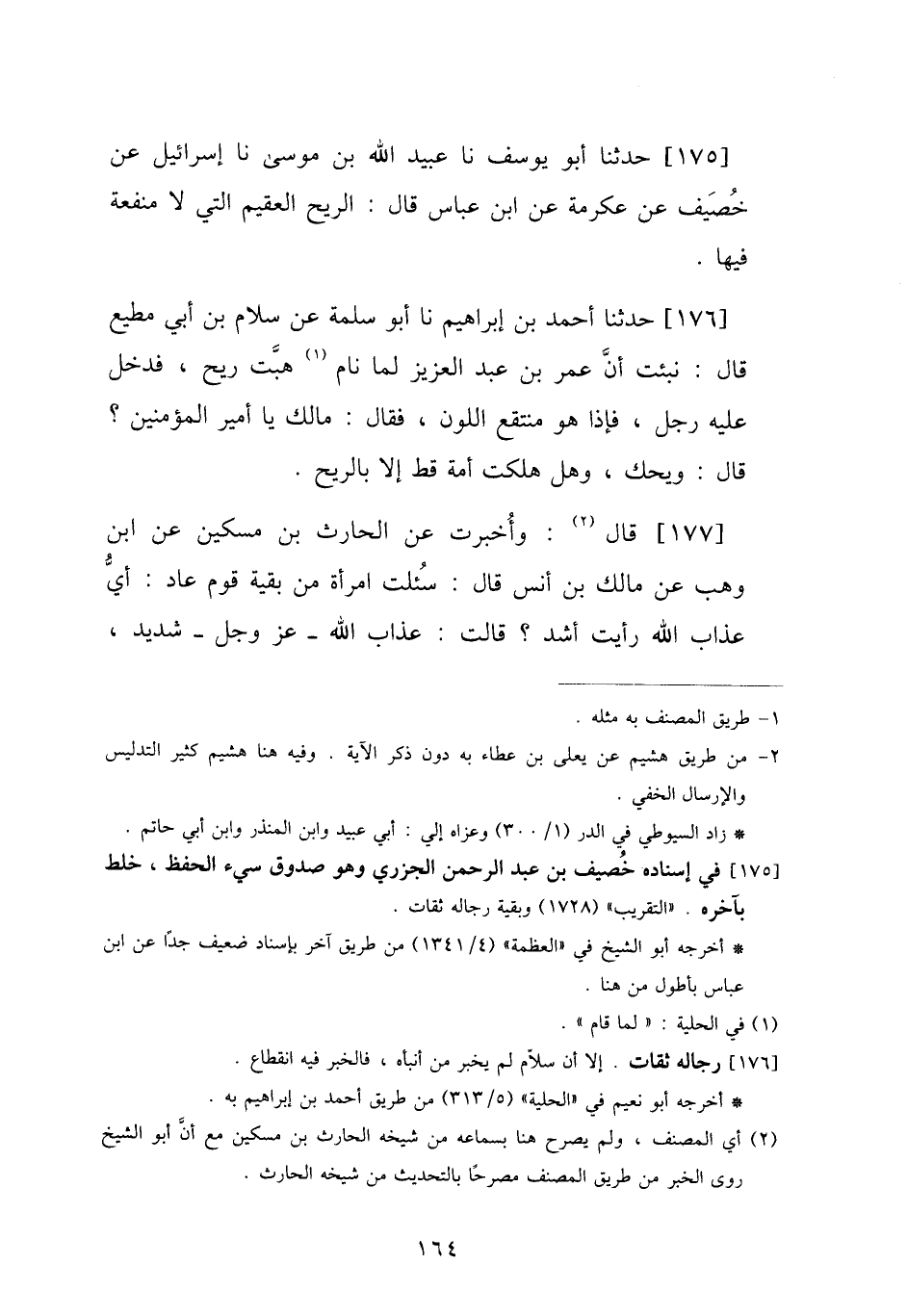 177 - قَالَ: وَأُخْبِرْتُ عَنِ الْحَارِثِ بْنِ مِسْكِينٍ، عَنِ ابْنِ وَهْبٍ، عَنْ مَالِكِ بْنِ أَنَسٍ، قَالَ: " سُئِلَتِ امْرَأَةٌ مِنْ بَقِيَّةِ قَوْمِ عَادٍ: §أَيُّ عَذَابِ اللَّهِ رَأَيْتِ أَشَدُّ؟ قَالَتْ: عَذَابُ اللَّهِ عَزَّ وَجَلَّ شَدِيدٌ، -[165]- وَسَلَامُ اللَّهِ تَعَالَى وَرَحْمَتُهُ عَلَى لَيْلَةٍ لَا رِيحَ فِيهَا، قَالَتْ: وَلَقَدْ رَأَيْتُ الْعِيرَ تَحْمِلُهَا الرِّيحُ بَيْنَ السَّمَاءِ وَالْأَرْضِ "