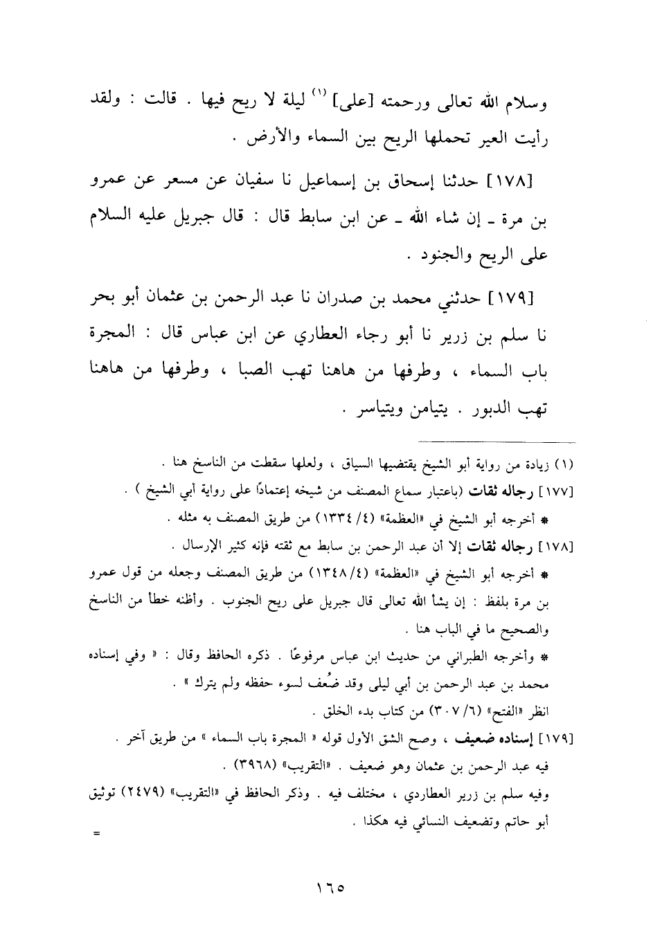 178 - حَدَّثَنَا إِسْحَاقُ بْنُ إِسْمَاعِيلَ، نا سُفْيَانُ، عَنْ مِسْعَرٍ، عَنْ عَمْرِو بْنِ مُرَّةَ إِنْ شَاءَ اللَّهُ، عَنِ ابْنِ سَابِطٍ، قَالَ: " §قَالَ: جِبْرِيلُ عَلَيْهِ السَّلَامُ عَلَى الرِّيحِ وَالْجُنُودِ "
