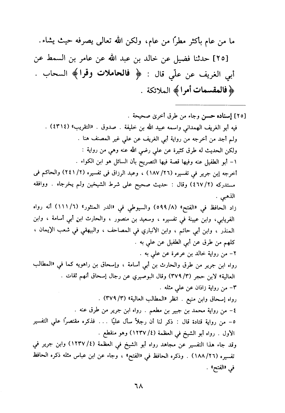 25 - حَدَّثَنَا فُضَيْلٌ، عَنْ خَالِدِ بْنِ عَبْدِ اللَّهِ، عَنْ عَامِرِ بْنِ السِّمْطِ، عَنْ أَبِي الْغَرِيفِ، عَنْ عَلِيٍّ، قَالَ: " {§فَالْحَامِلَاتِ وِقْرًا} [الذاريات: 2] السَّحَابُ، {فَالْمُقَسِّمَاتِ أَمْرًا} [الذاريات: 4] الْمَلَائِكَةُ "