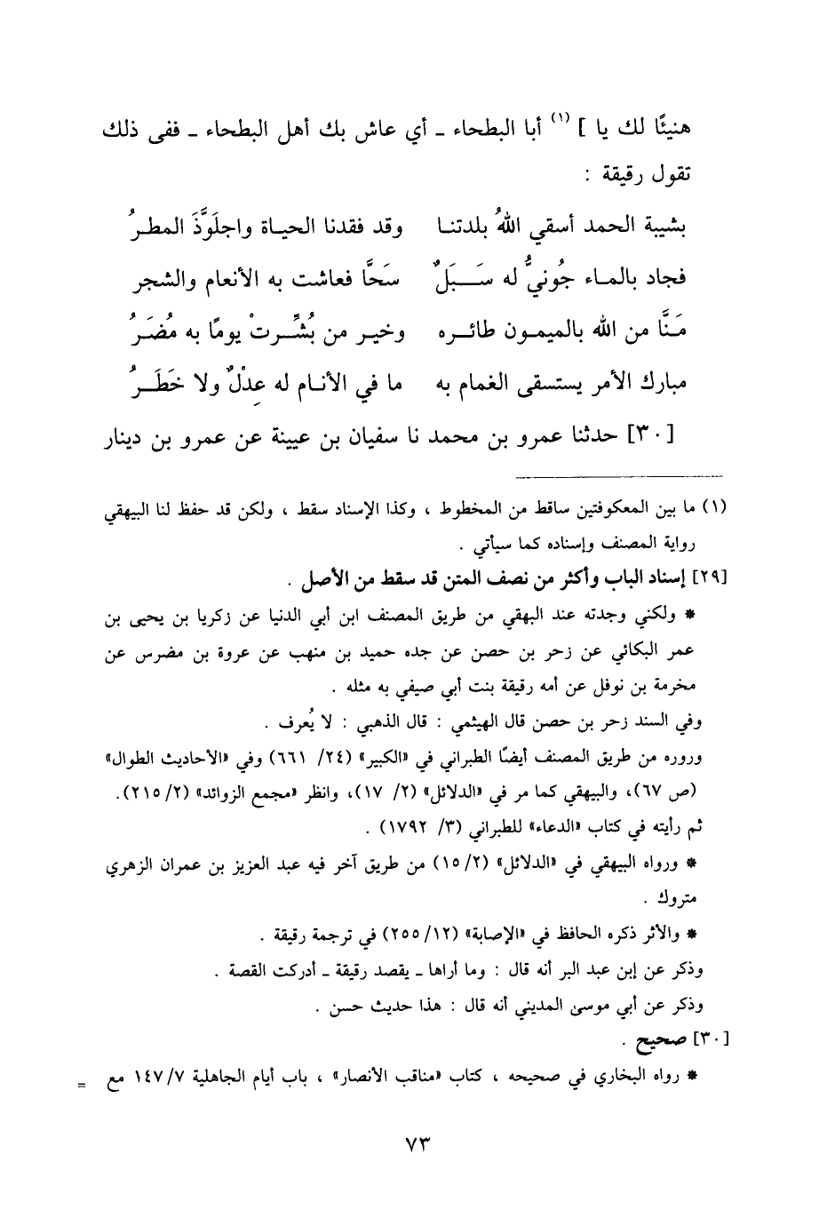30 - حَدَّثَنَا عَمْرُو بْنُ مُحَمَّدٍ، نا سُفْيَانُ بْنُ عُيَيْنَةَ، عَنْ عَمْرِو بْنِ دِينَارٍ، -[74]- عَنْ سَعِيدِ بْنِ الْمُسَيِّبِ، عَنْ أَبِيهِ، عَنْ جَدِّهِ، قَالَ: «§أَذْكُرُ سَيْلًا جَاءَ فِي الْجَاهِلِيَّةِ سَدَّ مَا بَيْنَ الْجَبَلَيْنِ»