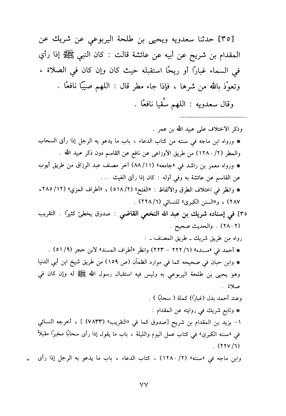 35 - حَدَّثَنَا سَعْدَوَيْهِ، وَيَحْيَى بْنُ طَلْحَةَ الْيَرْبُوعِيُّ، عَنْ شَرِيكٍ، عَنِ الْمِقْدَامِ بْنِ شُرَيْحٍ، عَنْ أَبِيهِ، عَنْ عَائِشَةَ، قَالَتْ: كَانَ النَّبِيُّ صَلَّى اللهُ عَلَيْهِ وَسَلَّمَ، §إِذَا رَأَى فِي السَّمَاءِ غُبَارًا أَوْ رِيحًا اسْتَقْبَلَهُ حَيْثُ كَانَ وَإِنْ كَانَ فِي الصَّلَاةِ، وَتَعَوَّذَ بِاللَّهِ مِنْ شَرِّهَا، فَإِذَا جَاءَ مَطَرٌ قَالَ: «اللَّهُمَّ صَيِّبًا نَافِعًا» ، وَقَالَ سَعْدَوَيْهِ: «اللَّهُمَّ سُقْيًا نَافِعًا»