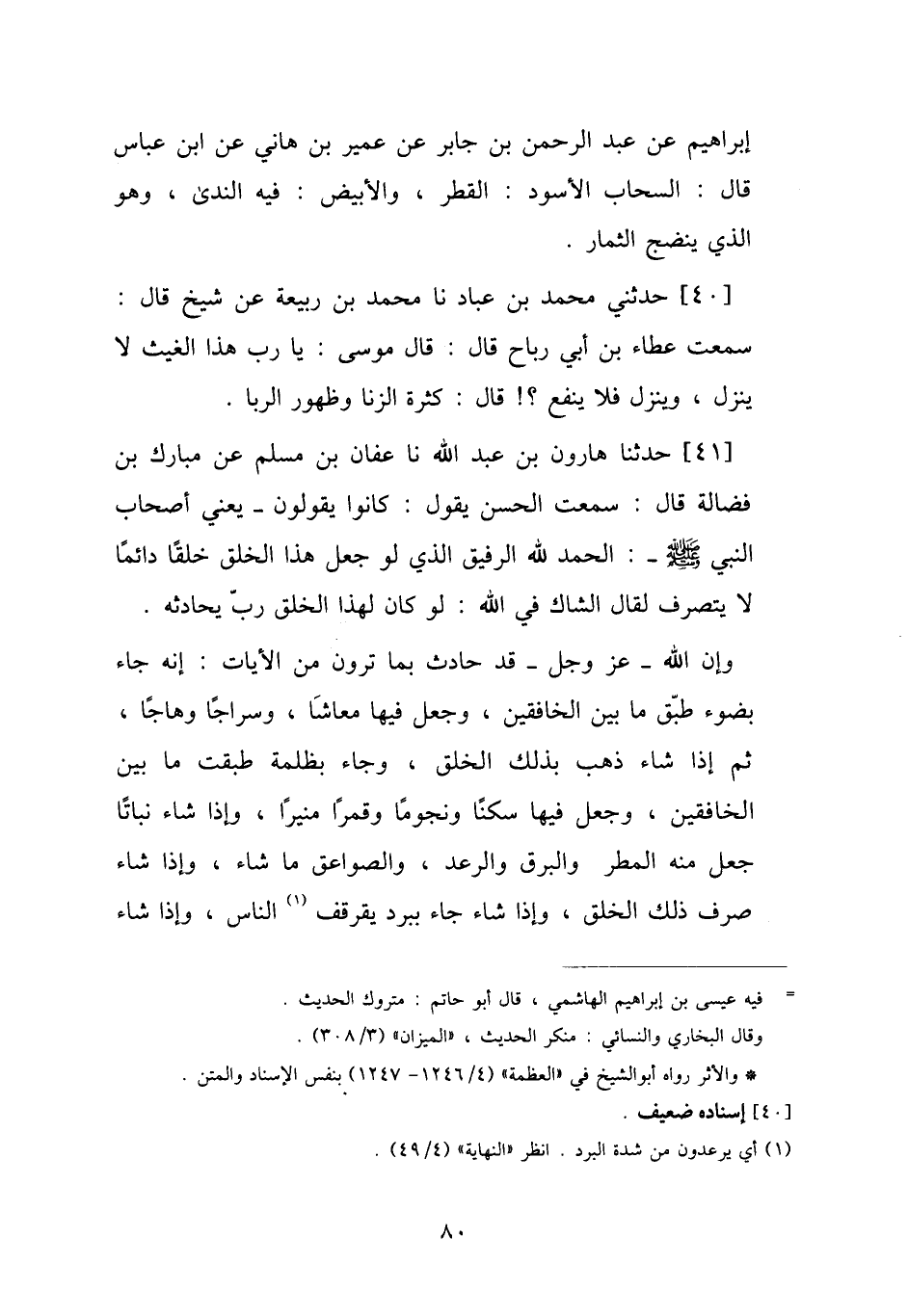 41 - حَدَّثَنَا هَارُونُ بْنُ عَبْدِ اللَّهِ، نا عَفَّانُ بْنُ مُسْلِمٍ، عَنْ مُبَارَكِ بْنِ فَضَالَةَ، قَالَ: سَمِعْتُ الْحَسَنَ، يَقُولُ: " كَانُوا يَقُولُونَ - يَعْنِي أَصْحَابَ النَّبِيِّ صَلَّى اللهُ عَلَيْهِ وَسَلَّمَ -: §الْحَمْدُ لِلَّهِ الرَّفِيقِ، الَّذِي لَوْ جَعَلَ هَذَا الْخَلْقَ خَلْقًا دَائِمًا لَا يَتَصَرَّفُ لَقَالَ الشَّاكُّ فِي اللَّهِ: لَوْ كَانَ لِهَذَا الْخَلْقِ رَبٌّ يُحَادِثُهُ. وَإِنَّ اللَّهَ عَزَّ وَجَلَّ قَدْ حَادَثَ بِمَا تَرَوْنَ مِنَ الْآيَاتِ: إِنَّهُ جَاءَ بِضَوْءٍ طَبَّقَ مَا بَيْنَ الْخَافِقَيْنِ، وَجَعَلَ فِيهَا مَعَاشًا، وَسِرَاجًا وَهَّاجًا، ثُمَّ إِذَا شَاءَ ذَهَبَ بِذَلِكَ الْخَلْقِ وَجَاءَ بِظُلْمَةٍ طَبَّقَتْ مَا بَيْنَ الْخَافِقَيْنِ، وَجَعَلَ فِيهَا سَكَنًا، وَنُجُومًا، وَقَمَرًا مُنِيرًا، وَإِذَا شَاءَ نَبَاتًا جَعَلَ مِنْهُ الْمَطَرَ، وَالْبَرْقَ، وَالرَّعْدَ، وَالصَّوَاعِقَ مَا شَاءَ، وَإِذَا شَاءَ صَرَفَ ذَلِكَ الْخَلْقَ وَإِذَا شَاءَ جَاءَ بِبَرْدٍ يُقَرْقِفُ النَّاسَ وَإِذَا شَاءَ -[81]- ذَهَبَ بِذَلِكَ وَجَاءَ بِحَرٍّ يَأْخُذُ بِأَنْفَاسِ النَّاسِ لِيَعْلَمَ النَّاسُ أَنَّ لِهَذَا الْخَلْقِ رَبًّا هُوَ يُحَادِثُهُ بِمَا تَرَوْنَ مِنَ الْآيَاتِ، كَذَلِكَ إِذَا شَاءَ ذَهَبَ بِالدُّنْيَا وَجَاءَ بِالْآخِرَةِ "