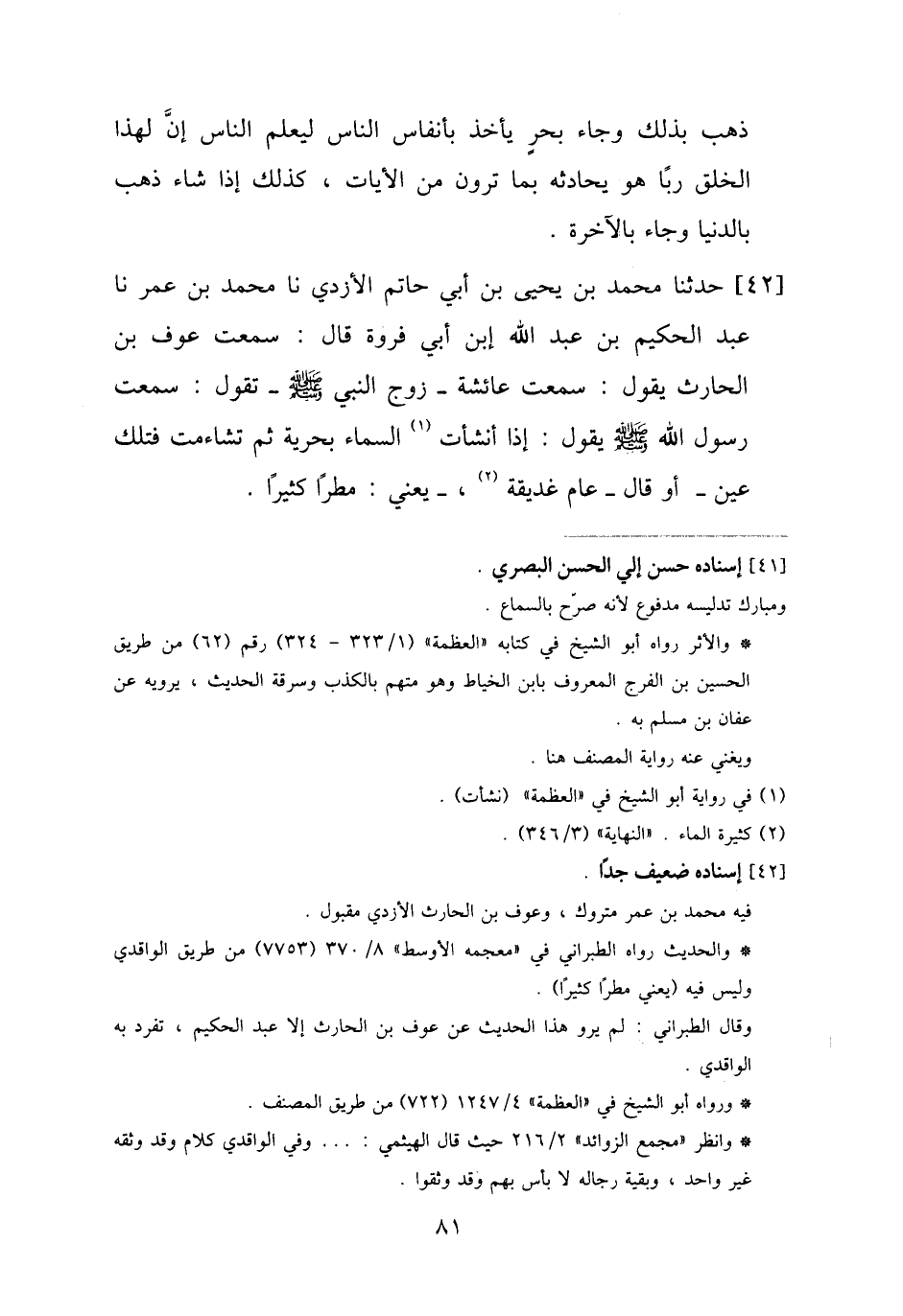 42 - حَدَّثَنَا مُحَمَّدُ بْنُ يَحْيَى بْنِ أَبِي حَاتِمٍ الْأَزْدِيُّ، نا مُحَمَّدُ بْنُ عُمَرَ، نا عَبْدُ الْحَكِيمِ بْنُ عَبْدِ اللَّهِ بْنِ أَبِي فَرْوَةَ، قَالَ: سَمِعْتُ عَوْفَ بْنَ الْحَارِثِ، يَقُولُ: سَمِعْتُ عَائِشَةَ زَوْجَ النَّبِيِّ صَلَّى اللهُ عَلَيْهِ وَسَلَّمَ، تَقُولُ: سَمِعْتُ رَسُولَ اللَّهِ صَلَّى اللهُ عَلَيْهِ وَسَلَّمَ يَقُولُ: " §إِذَا أَنْشَأَتِ السَّمَاءُ بَحْرِيَّةً ثُمَّ تَشَاءَمَتْ فَتِلْكَ عَيْنٌ، أَوْ قَالَ: عَامٌ غَدِيقَةٌ "، يَعْنِي: مَطَرًا كَثِيرًا "