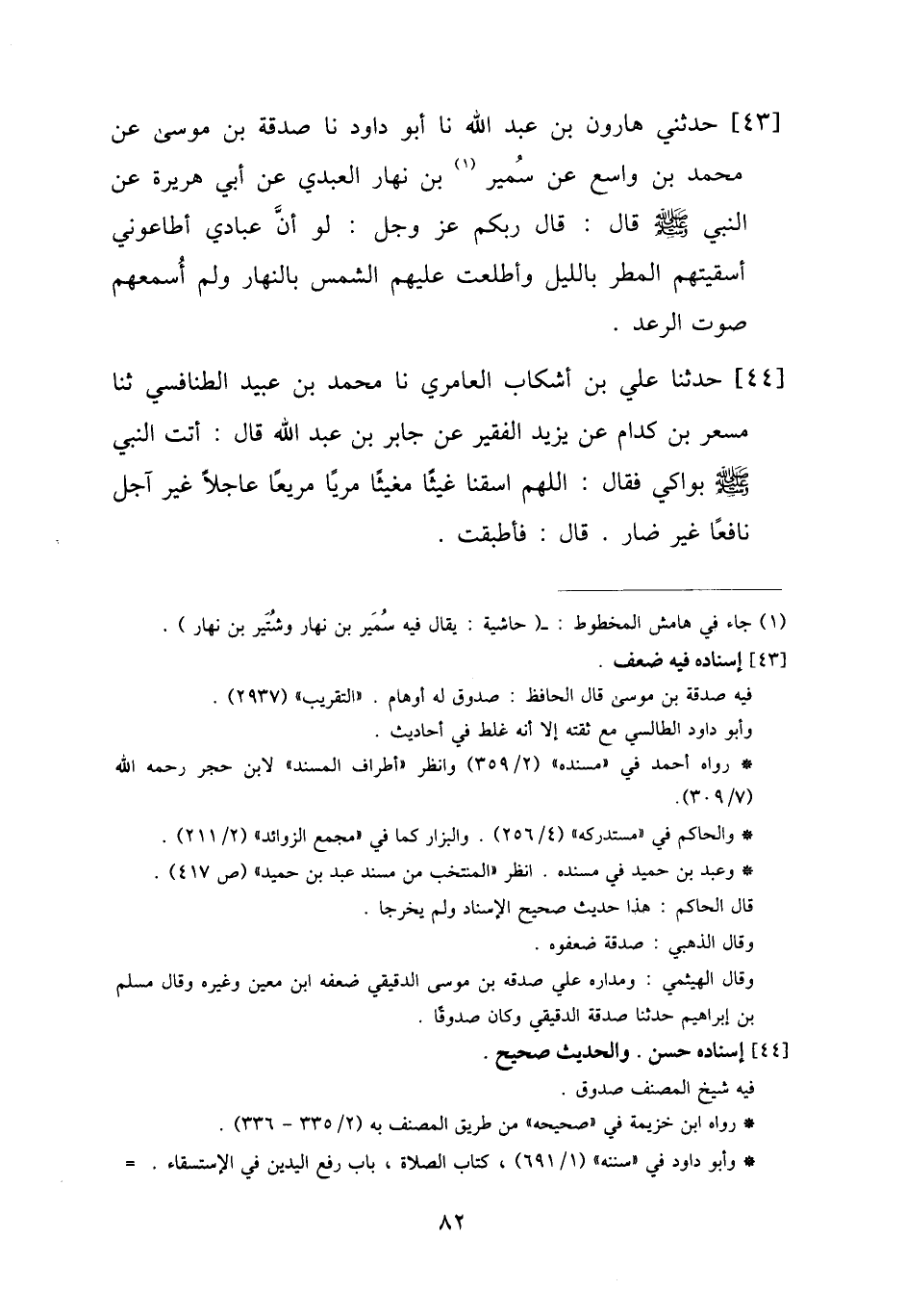 43 - حَدَّثَنِي هَارُونُ بْنُ عَبْدِ اللَّهِ، نا أَبُو دَاوُدَ، نا صَدَقَةُ بْنُ مُوسَى، عَنْ مُحَمَّدِ بْنِ وَاسِعٍ، عَنْ سُمَيْرِ بْنِ نَهَارٍ الْعَبْدِيِّ، عَنْ أَبِي هُرَيْرَةَ، عَنِ النَّبِيِّ صَلَّى اللهُ عَلَيْهِ وَسَلَّمَ قَالَ: " قَالَ رَبُّكُمْ عَزَّ وَجَلَّ: §لَوْ أَنَّ عِبَادِي أَطَاعُونِي أَسْقَيْتُهُمُ الْمَطَرَ بِاللَّيْلِ، وَأَطْلَعْتُ عَلَيْهِمُ الشَّمْسَ بِالنَّهَارِ، وَلَمْ أُسْمِعْهُمْ صَوْتَ الرَّعْدِ "