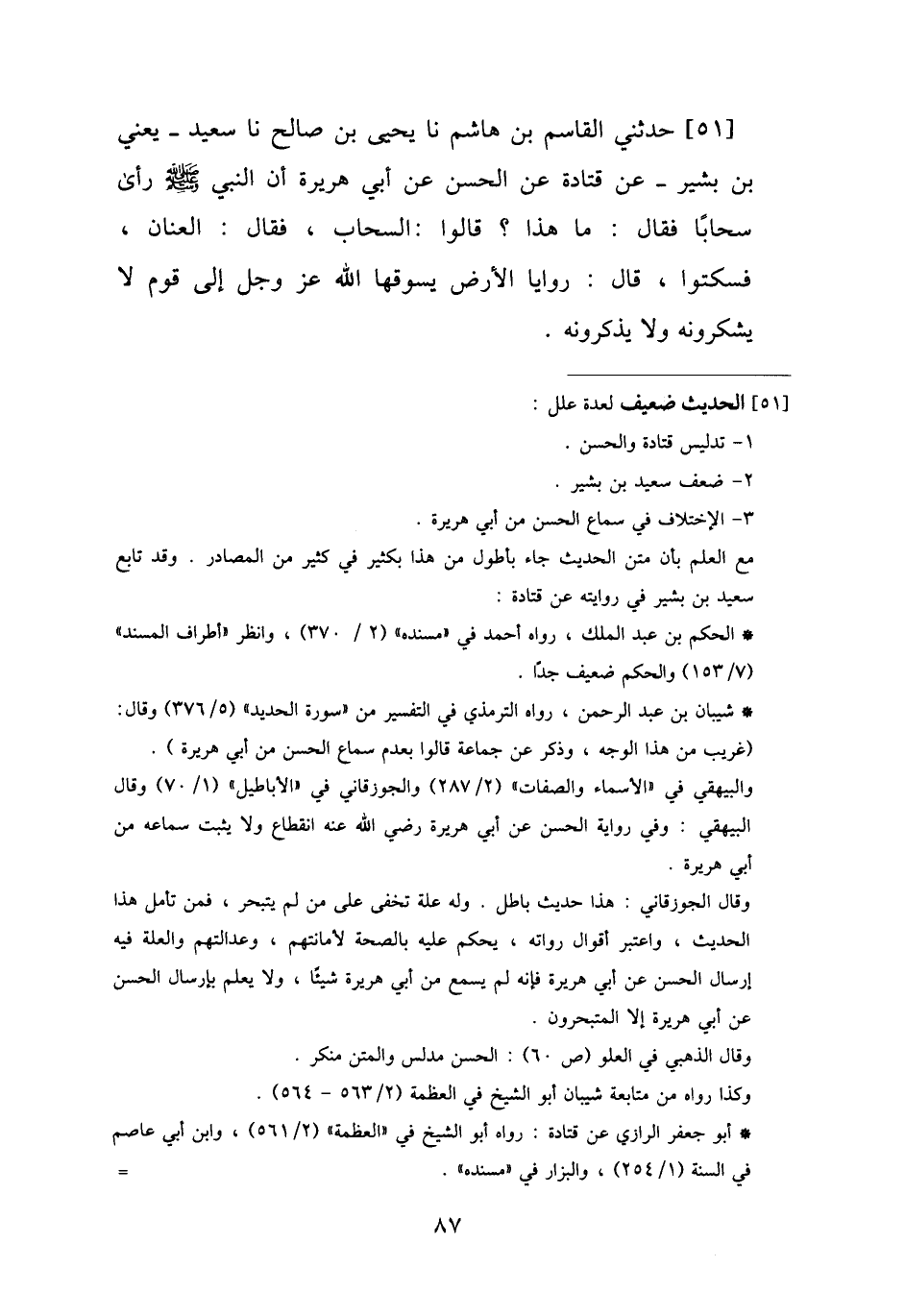 51 - حَدَّثَنِي الْقَاسِمُ بْنُ هَاشِمٍ، نا يَحْيَى بْنُ صَالِحٍ، نا سَعِيدٌ يَعْنِي ابْنٍ بَشِيرٍ، عَنْ قَتَادَةَ، عَنِ الْحَسَنِ، عَنْ أَبِي هُرَيْرَةَ، أَنَّ النَّبِيَّ صَلَّى اللهُ عَلَيْهِ وَسَلَّمَ رَأَى سَحَابًا فَقَالَ: «مَا هَذَا؟» قَالُوا السَّحَابُ، فَقَالَ: «الْعَنَانُ» ، فَسَكَتُوا، قَالَ: «§رَوَايَا الْأَرْضِ، يَسُوقُهَا اللَّهُ عَزَّ وَجَلَّ إِلَى قَوْمٍ لَا يَشْكُرُونَهُ وَلَا يَذْكُرُونَهُ»
