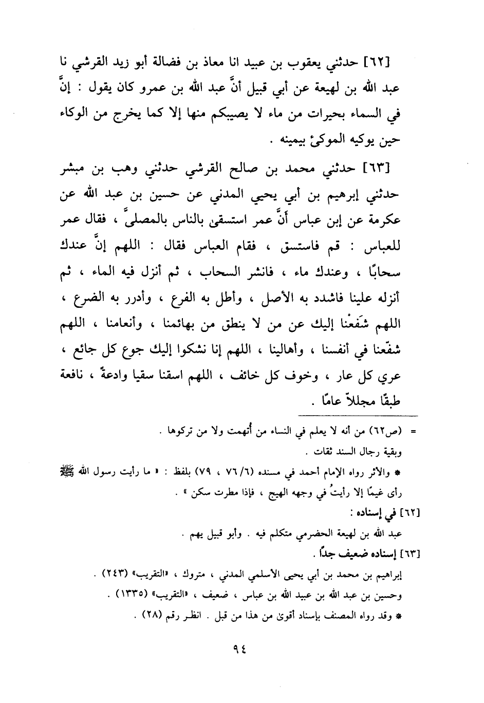 63 - حَدَّثَنِي مُحَمَّدُ بْنُ صَالِحٍ الْقُرَشِيُّ، حَدَّثَنِي وَهْبُ بْنُ مُبَشِّرٍ، حَدَّثَنِي إِبْرَاهِيمُ بْنُ أَبِي يَحْيَى الْمَدَنِيُّ، عَنْ حُسَيْنِ بْنِ عَبْدِ اللَّهِ، عَنْ عِكْرِمَةَ، عَنِ ابْنِ عَبَّاسٍ، أَنَّ عُمَرَ، اسْتَسْقَى بِالنَّاسِ بِالْمُصَلَّى فَقَالَ عُمَرُ لِلْعَبَّاسِ: قُمْ فَاسْتَسْقِ، فَقَامَ الْعَبَّاسُ فَقَالَ: اللَّهُمَّ إِنَّ §عِنْدَكَ سَحَابًا، وَعِنْدَكَ مَاءً، فَانْشُرِ السَّحَابَ، ثُمَّ أَنْزِلْ فِيهِ الْمَاءَ، ثُمَّ أَنْزِلْهِ عَلَيْنَا، فَاشْدُدْ بِهِ الْأَصْلَ، وَأَطِلْ بِهِ الْفَرْعَ، وَأَدْرِرْ بِهِ الضَّرْعَ، اللَّهُمَّ شَفِّعْنَا إِلَيْكَ عَنْ مَنْ لَا يَنْطِقُ مِنْ بَهَائِمِنَا وَأَنْعَامِنَا، اللَّهُمَّ شَفِّعْنَا فِي أَنْفُسِنَا وَأَهَالِينَا، اللَّهُمَّ إِنَّا نَشْكُو إِلَيْكَ جُوعَ كُلِّ جَائِعٍ، وَعُرْيَ كُلِّ عَارٍ، وَخَوْفَ كُلِّ خَائِفٍ، اللَّهُمَّ اسْقِنَا سَقْيًا وَادِعَةً، نَافِعَةً طَبَقًا، مُجَلَّلًا عَامًّا "