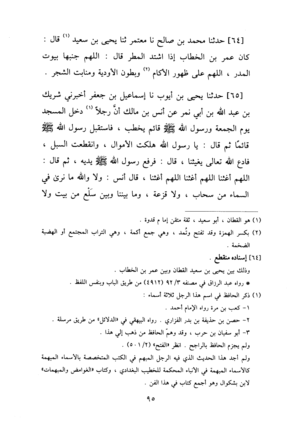 64 - حَدَّثَنَا مُحَمَّدُ بْنُ صَالِحٍ، نا مُعْتَمِرٌ، ثنا يَحْيَى بْنُ سَعِيدٍ، قَالَ: كَانَ عُمَرُ بْنُ الْخَطَّابِ إِذَا اشْتَدَّ الْمَطَرُ قَالَ: «اللَّهُمَّ §جَنِّبْهَا بُيُوتَ الْمَدَرِ، اللَّهُمَّ عَلَى ظُهُورِ الْآكَامِ، وَبُطُونِ الْأَوْدِيَةِ، وَمَنَابِتِ الشَّجَرِ»