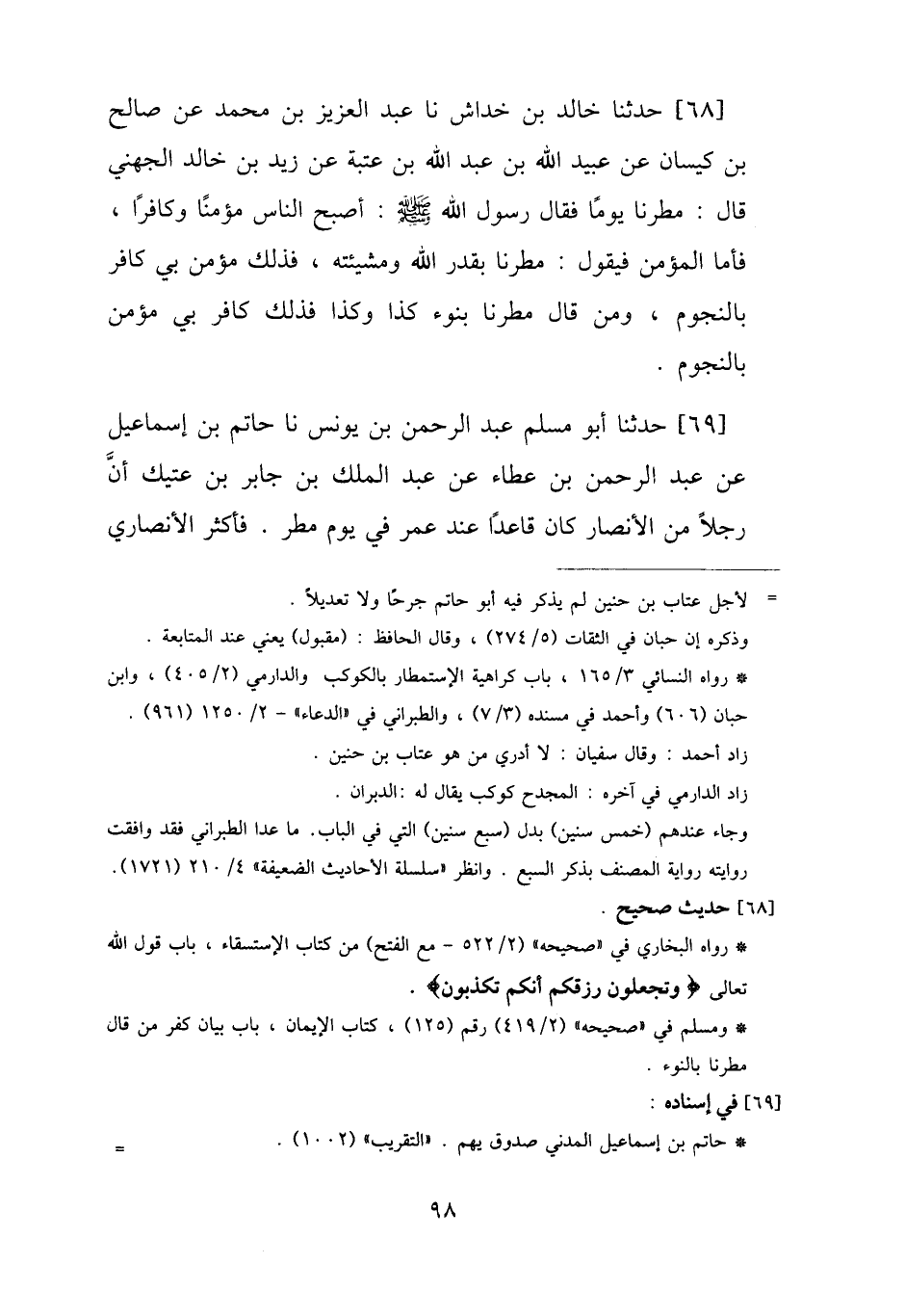 68 - حَدَّثَنَا خَالِدَ بْنَ خِدَاشٍ، نا عَبْدُ الْعَزِيزِ بْنَ مُحَمَّدٍ، عَنْ صَالِحِ بْنُ كَيْسَانَ، عَنْ عُبَيْدِ اللَّهِ بْنِ عَبْدِ اللَّهِ بْنِ عُتْبَةَ، عَنْ زَيْدِ بْنِ خَالِدٍ الْجُهَنِيِّ، قَالَ: مُطِرْنَا يَوْمًا فَقَالَ: رَسُولُ اللَّهِ صَلَّى اللهُ عَلَيْهِ وَسَلَّمَ: " §أَصْبَحَ النَّاسُ مُؤْمِنًا وَكَافِرًا، فَأَمَّا الْمُؤْمِنُ فَيَقُولُ: مُطِرْنَا بِقَدَرِ اللَّهِ وَمَشِيئَتِهِ، فَذَلِكَ مُؤْمِنٌ بِي كَافِرٌ بِالنُّجُومِ، وَمَنْ قَالَ مُطِرْنَا بِنَوْءِ كَذَا وَكَذَا فَذَلِكَ كَافِرٌ بِي مُؤْمِنٌ بِالنُّجُومِ "