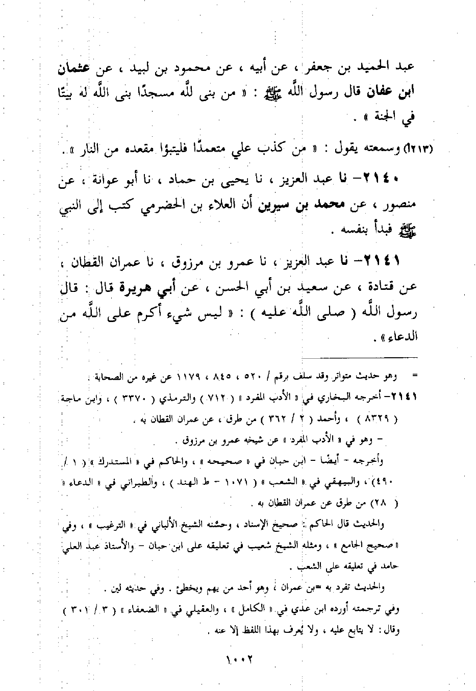 2141 - نا عَبْدُ الْعَزِيزِ، نا عَمْرُو بْنُ مَرْزُوقٍ، نا عِمْرَانُ الْقَطَّانُ، عَنْ قَتَادَةَ، عَنْ سَعِيدِ بْنِ أَبِي الْحَسَنِ، عَنْ أَبِي هُرَيْرَةَ قَالَ: قَالَ رَسُولُ اللَّهِ صَلَّى اللَّهُ عَلَيْهِ وَسَلَّمَ: §لَيْسَ شَيْءٌ أَكْرَمَ عَلَى اللَّهِ مِنَ الدُّعَاءِ