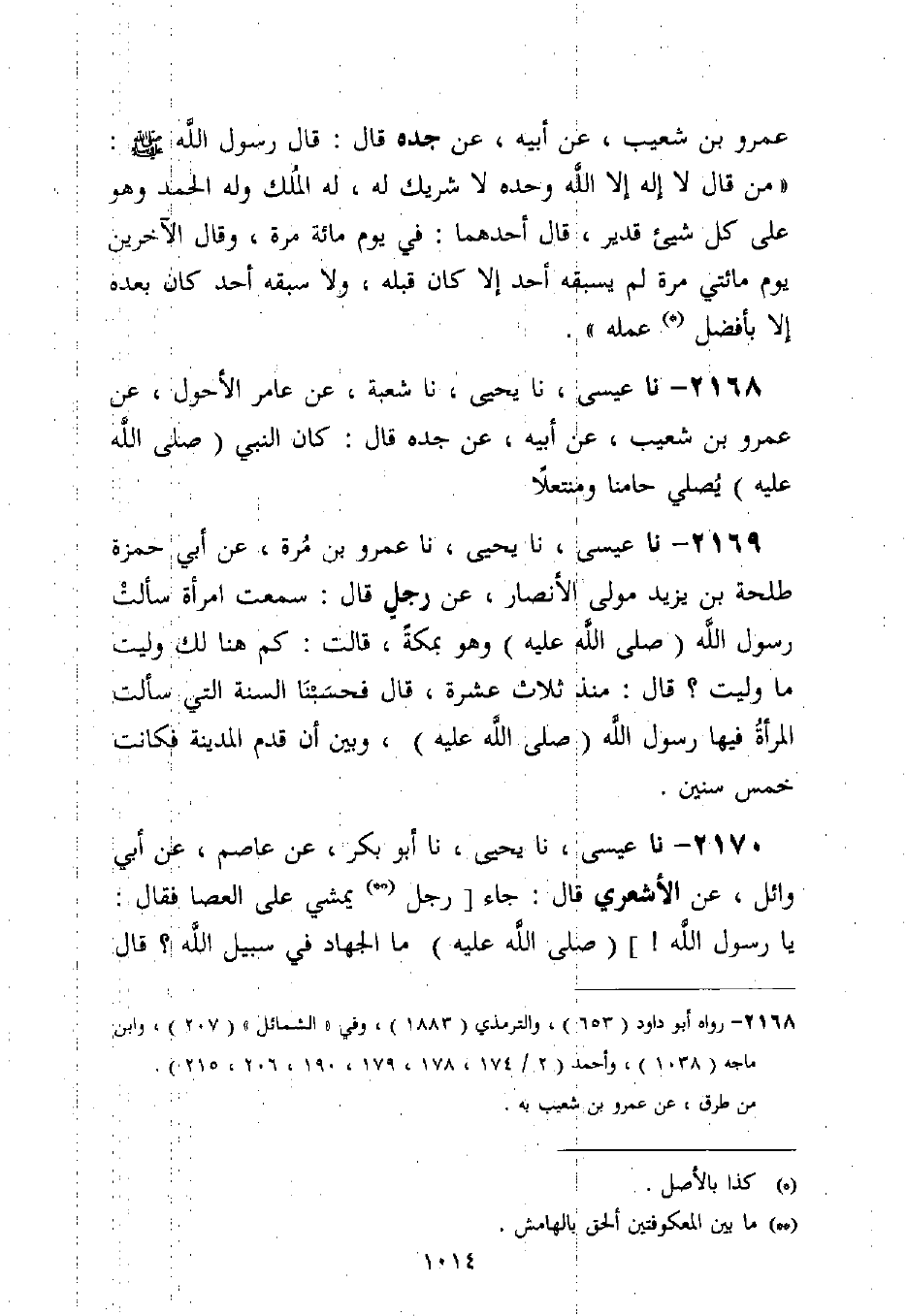 2168 - نا عِيسَى، نا يَحْيَى، نا شُعْبَةُ، عَنْ عَامِرٍ الْأَحْوَلِ، عَنْ عَمْرِو بْنِ شُعَيْبٍ، عَنْ أَبِيهِ، عَنْ جَدِّهِ قَالَ: §كَانَ النَّبِيُّ صَلَّى اللَّهُ عَلَيْهِ وَسَلَّمَ يُصَلِّي حَافِيًا وَمُنْتَعِلًا
