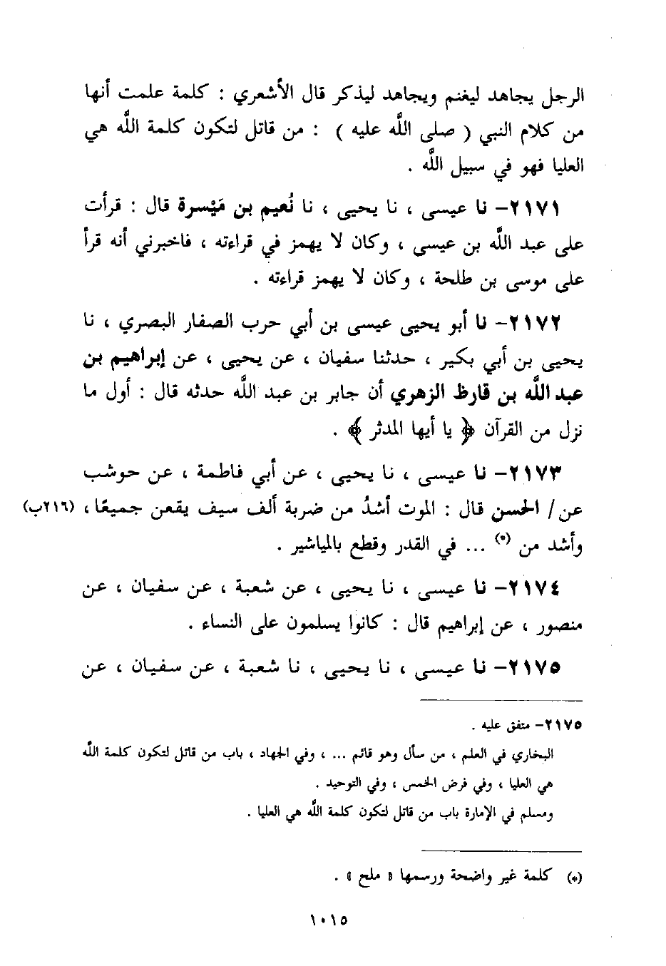 2171 - نا عِيسَى، نا يَحْيَى، نا نُعَيْمُ بْنُ مَيْسَرَةَ قَالَ: قَرَأْتُ عَلَى عَبْدِ اللَّهِ بْنِ عِيسَى، وَكَانَ لَا يَهْمِزُ فِي قِرَاءَتِهِ، فَأَخْبَرَنِي §أَنَّهُ، قَرَأَ عَلَى مُوسَى بْنِ طَلْحَةَ، وَكَانَ لَا يَهْمِزُ قِرَاءَتَهُ