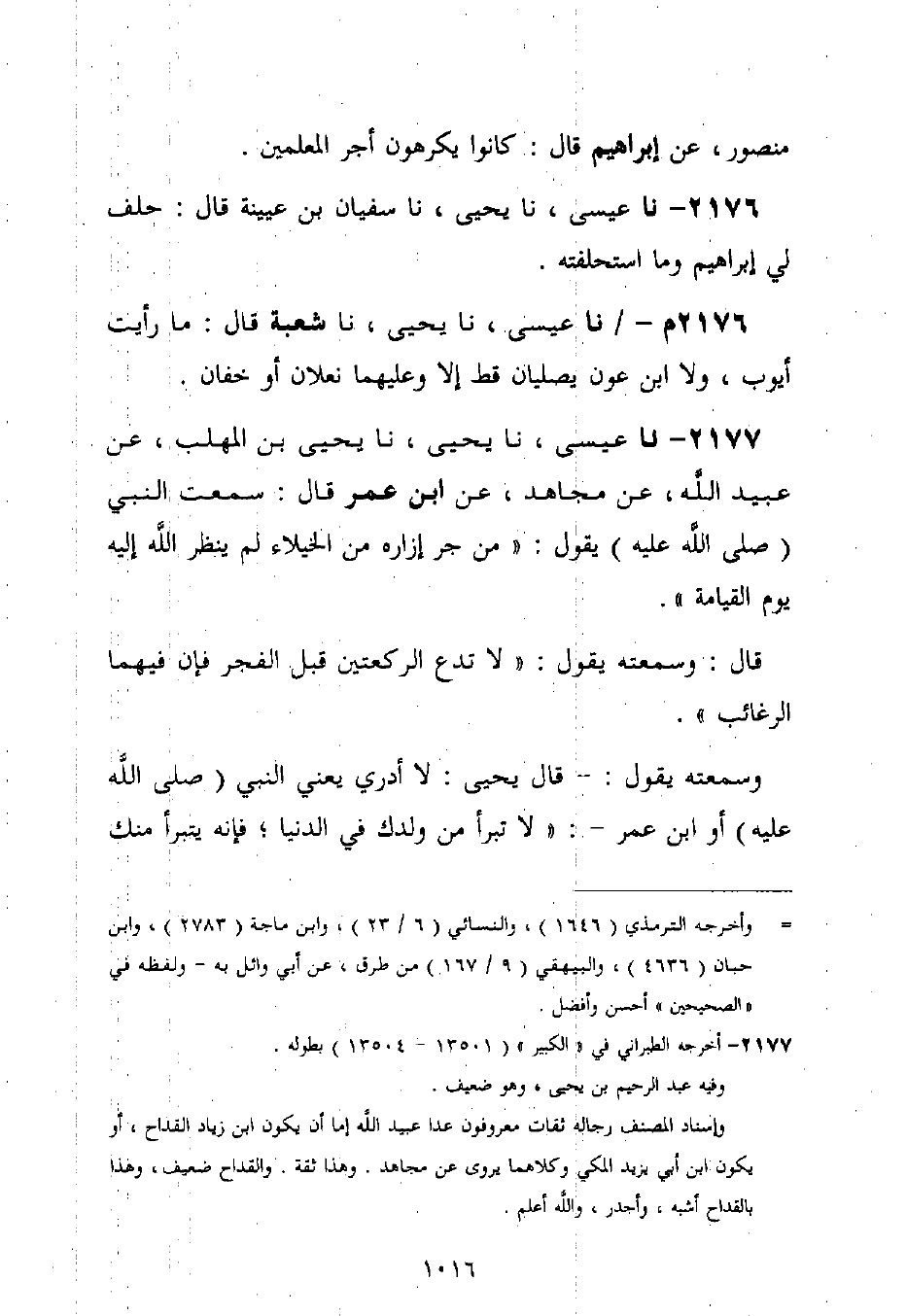 2177 - نا عِيسَى، نا يَحْيَى، نا يَحْيَى بْنُ الْمُهَلَّبِ، عَنْ عُبَيْدِ اللَّهِ، عَنْ مُجَاهِدٍ، عَنِ ابْنِ عُمَرَ قَالَ: سَمِعْتُ النَّبِيَّ صَلَّى اللَّهُ عَلَيْهِ وَسَلَّمَ يَقُولُ: §مَنْ جَرَّ إِزَارَهُ مِنَ الْخُيَلَاءِ لَمْ يَنْظُرِ اللَّهُ إِلَيْهِ يَوْمَ الْقِيَامَةِ قَالَ: وَسَمِعْتُهُ يَقُولُ: لَا تَدَعِ الرَّكْعَتَيْنِ قَبْلَ الْفَجْرِ، فَإِنَّ فِيهِمَا الرَّغَائِبُ، وَسَمِعْتُهُ يَقُولُ: قَالَ يَحْيَى: لَا أَدْرِي يَعْنِي النَّبِيَّ صَلَّى اللَّهُ عَلَيْهِ وَسَلَّمَ، أَوِ ابْنَ عُمَرَ: لَا تَبَرَّأْ مِنْ وَلَدِكِ فِي الدُّنْيَا، فَإِنَّهُ يَتَبَرَّأُ مِنْكَ -[1017]- يَوْمَ الْقِيَامَةِ، فَيَفْضَحُكَ عَلَى رُءُوسِ الْأَشْهَادِ كَمَا فَضَحْتَهُ فِي الدُّنْيَا، وَسَمِعْتُهُ يَقُولُ: لَا تَمُوتَنَّ وَعَلَيْكَ دَيْنٌ، فَإِنَّهُ لَيْسَ ثَمَّ قَضَاءُ دِينَارٍ وَلَا دِرْهَمٍ، وَلَكِنِ الْحَسَنَاتُ وَالسَّيِّئَاتُ كَمَا قَالَ اللَّهُ: {وَلَا يَظْلِمُ رَبُّكَ أَحَدًا} [الكهف: 49]