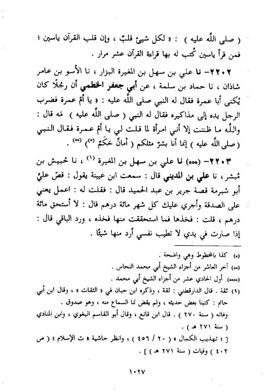 2203 - نا عَلِيُّ بْنُ سَهْلِ بْنِ الْمُغِيرَةِ، نا حُبَيْشُ بْنُ مُبَشِّرٍ، نا عَلِيُّ بْنُ الْمَدِينِيِّ قَالَ: سَمِعْتُ ابْنَ عُيَيْنَةَ يَقُولُ: §قَصَّ عَلَيَّ أَبُو شُبْرُمَةَ قِصَّةَ جَرِيرِ بْنِ عَبْدِ الْحَمِيدِ قَالَ: فَقُلْتُ لَهُ: اعْمَلْ , يَعْنِي عَلَى الصَّدَقَةِ، وَأَجْرِي عَلَيْكَ كُلَّ شَهْرٍ مِائَةُ دِرْهَمٍ قَالَ: لَا أَسْتَحِقُّ مِائَةَ دِرْهَمٍ، قُلْتُ: فَخُذْهَا , فَمَا اسْتَحْقَقْتَ مِنْهَا فَخُذْهُ، وَرُدَّ الْبَاقِي قَالَ: إِذَا صَارَتْ فِي يَدِي لَا تَطِيبُ نَفْسِي أَرُدَّ مِنْهَا شَيْئًا