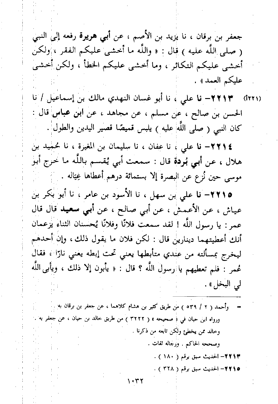 2215 - نا عَلِيُّ بْنُ سَهْلٍ، نا الْأَسْوَدُ بْنُ عَامِرٍ، نا أَبُو بَكْرِ بْنُ عَيَّاشٍ، عَنِ الْأَعْمَشِ، عَنْ أَبِي صَالِحٍ، عَنْ أَبِي سَعِيدٍ قَالَ: قَالَ عُمَرُ: يَا رَسُولَ اللَّهِ، لَقَدْ سَمِعْتُ فُلَانًا وَفُلَانًا يُحْسِنَانِ الثَّنَاءَ، يَزْعُمَانِ أَنَّكَ أَعْطَيْتَهُمَا دِينَارَيْنِ، قَالَ: §لَكِنْ فُلَانٌ مَا يَقُولُ ذَلِكَ، وَإِنَّ أَحَدَهُمْ لَيَخْرُجُ بِمَسْأَلَتِهِ مِنْ عِنْدِي مُتَأَبِّطَهَا , يَعْنِي تَحْتَ إِبْطِهِ يَعْنِي نَارًا، فَقَالَ عُمَرُ: فَلِمَ تُعْطِيهِمْ يَا رَسُولَ اللَّهِ؟ قَالَ: يَأْبَوْنَ إِلَّا ذَلِكَ، وَيَأْبَى اللَّهُ لِيَ الْبُخْلَ