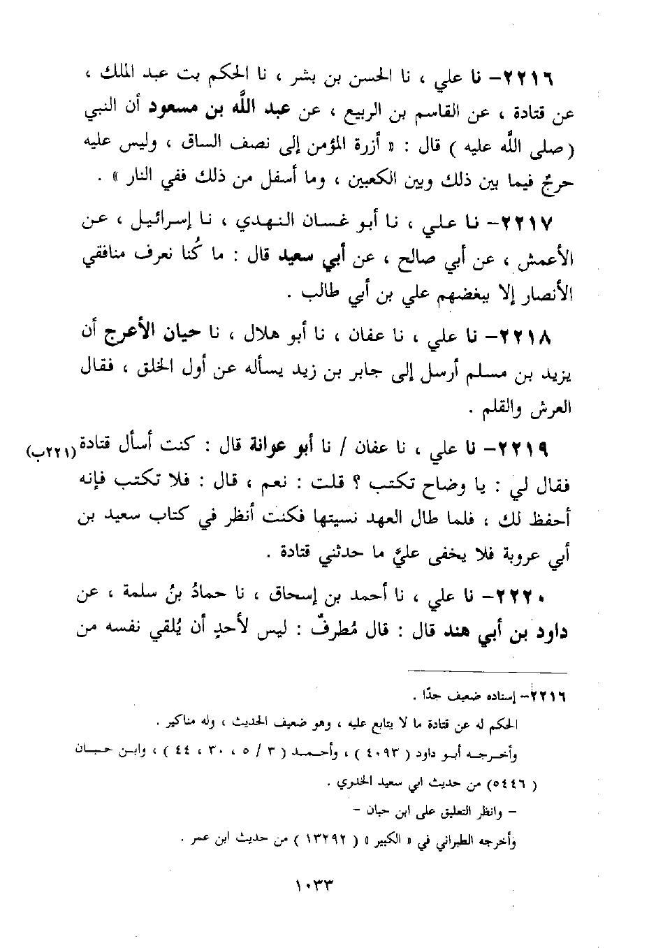 2216 - نا عَلِيٌّ، نا الْحَسَنُ بْنُ بِشْرٍ، نا الْحَكَمُ بْنُ عَبْدِ الْمَلِكِ، عَنْ قَتَادَةَ، عَنِ الْقَاسِمِ بْنِ الرَّبِيعِ، عَنْ عَبْدِ اللَّهِ بْنِ مَسْعُودٍ، أَنَّ النَّبِيَّ صَلَّى اللَّهُ عَلَيْهِ وَسَلَّمَ قَالَ: §إِزْرَةُ الْمُؤْمِنِ إِلَى نِصْفِ السَّاقِ، وَلَيْسَ عَلَيْهِ حَرَجٌ فِيمَا بَيْنَ ذَلِكَ وَبَيْنَ الْكَعْبَيْنِ، وَمَا أَسْفَلَ مِنْ ذَلِكَ فَفِي النَّارِ