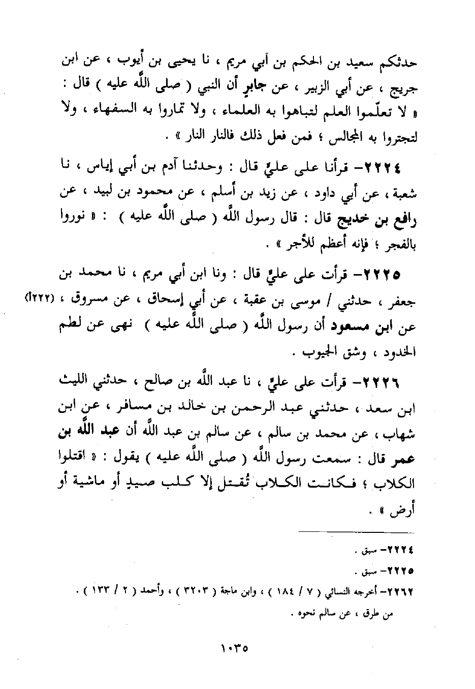2226 - قَرَأْتُ عَلَى عَلِيٍّ، نا عَبْدُ اللَّهِ بْنُ صَالِحٍ، حَدَّثَنِي اللَّيْثُ بْنُ سَعْدٍ، حَدَّثَنِي عَبْدُ الرَّحْمَنِ بْنُ خَالِدِ بْنِ مُسَافِرٍ، عَنِ ابْنِ شِهَابٍ، عَنْ مُحَمَّدِ بْنِ سَالِمٍ، عَنْ سَالِمِ بْنِ عَبْدِ اللَّهِ، أَنَّ عَبْدَ اللَّهِ بْنَ عُمَرَ قَالَ: سَمِعْتُ رَسُولَ اللَّهِ صَلَّى اللَّهُ عَلَيْهِ وَسَلَّمَ يَقُولُ: §اقْتُلُوا الْكِلَابَ، فَكَانَتِ الْكِلَابُ تُقْتَلُ إِلَّا كَلْبَ صَيْدٍ، أَوْ مَاشِيَةٍ، أَوْ أَرْضٍ