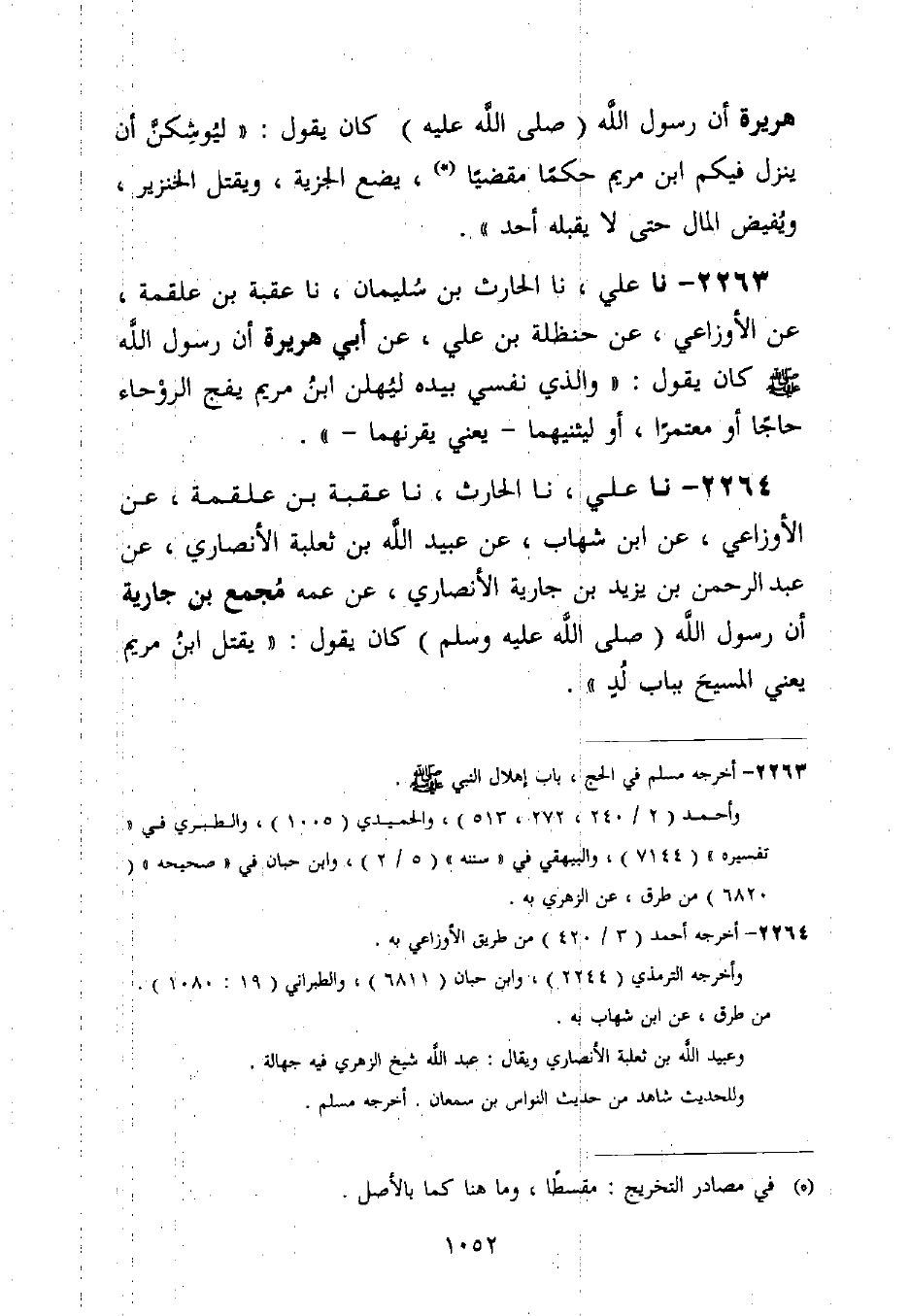 2264 - نا عَلِيٌّ، نا الْحَارِثُ، نا عُقْبَةُ بْنُ عَلْقَمَةَ، عَنِ الْأَوْزَاعِيِّ، عَنِ ابْنِ شِهَابٍ، عَنْ عُبَيْدِ اللَّهِ بْنِ ثَعْلَبَةَ الْأَنْصَارِيِّ، عَنْ عَبْدِ الرَّحْمَنِ بْنِ يَزِيدَ بْنِ جَارِيَةَ الْأَنْصَارِيِّ، عَنْ عَمِّهِ مُجَمِّعِ بْنِ جَارِيَةَ، أَنَّ رَسُولَ اللَّهِ صَلَّى اللَّهُ عَلَيْهِ وَسَلَّمَ كَانَ يَقُولُ: §يَقْتُلُ ابْنُ مَرْيَمَ , يَعْنِي الْمَسِيحَ , بِبَابِ لُدٍّ