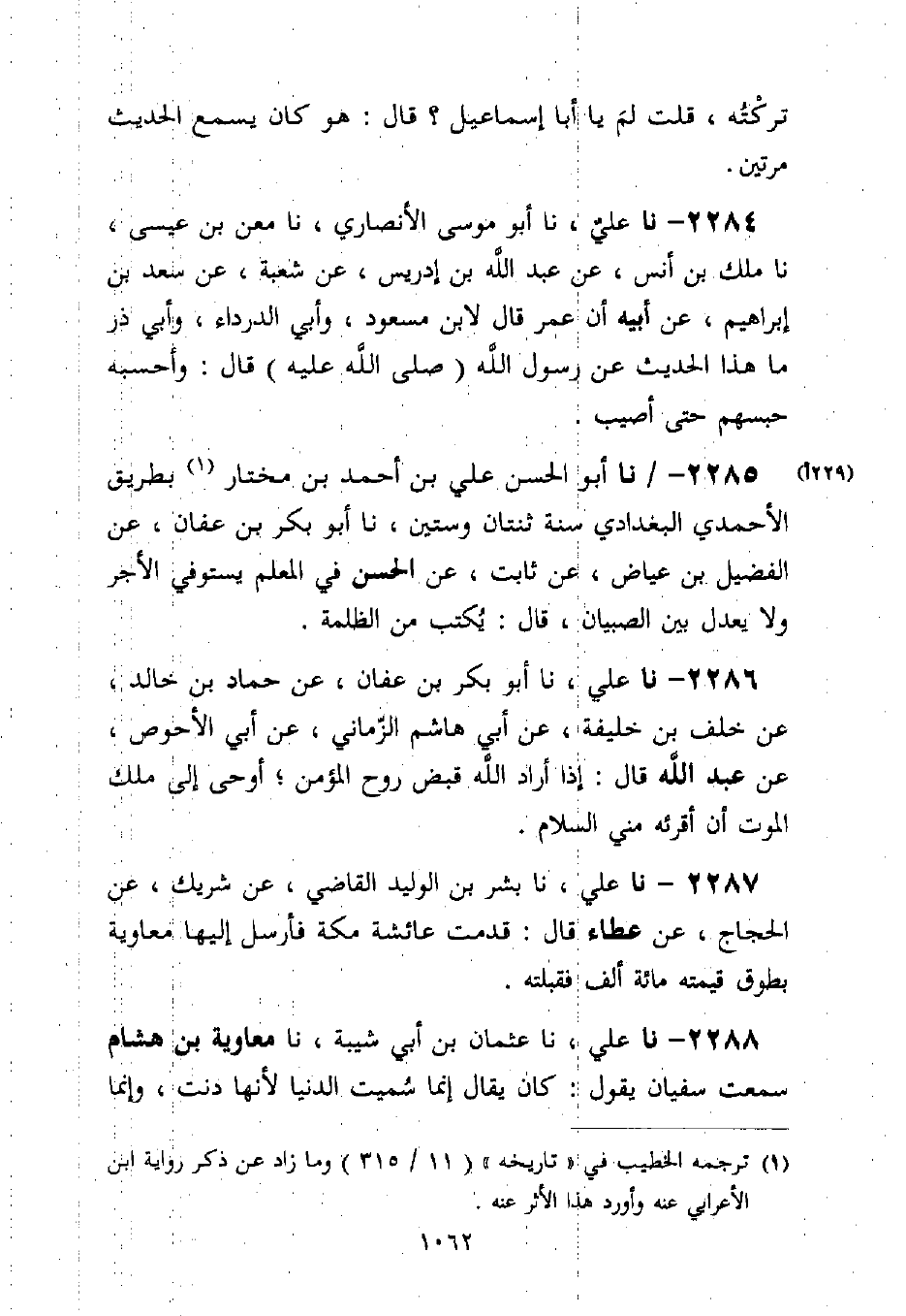 2284 - نا عَلِيٌّ، نا أَبُو مُوسَى الْأَنْصَارِيُّ، نا مَعْنُ بْنُ عِيسَى، نا مَالِكُ بْنُ أَنَسٍ، عَنْ عَبْدِ اللَّهِ بْنِ إِدْرِيسَ، عَنْ شُعْبَةَ، عَنْ سَعْدِ بْنِ إِبْرَاهِيمَ، عَنْ أَبِيهِ، أَنَّ عُمَرَ قَالَ لِابْنِ مَسْعُودٍ، وَأَبِي الدَّرْدَاءِ، وَأَبِي ذَرٍّ: §مَا هَذَا الْحَدِيثُ عَنْ رَسُولٍ اللَّهِ صَلَّى اللَّهُ عَلَيْهِ وَسَلَّمَ؟ قَالَ: وَأَحْسَبُهُ حَبَسَهُمْ حَتَّى أُصِيبَ